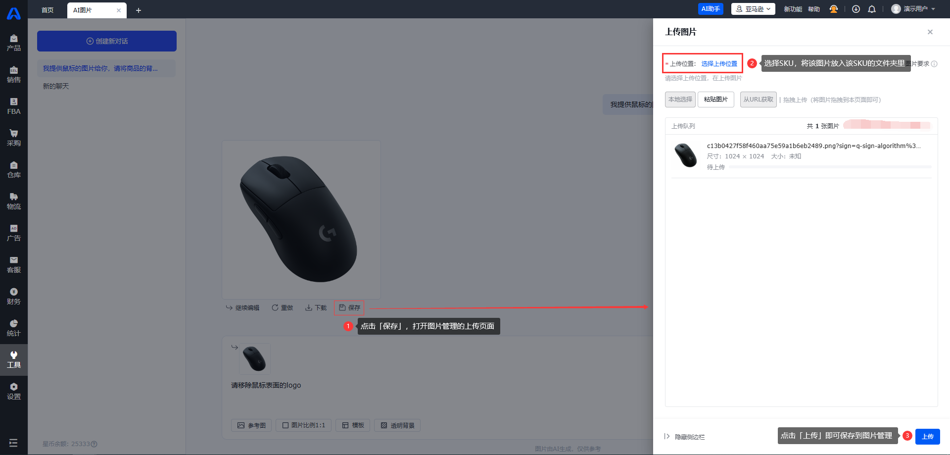 说明:生成结果的图片尺寸,目前固定是这3种;如果上传的原图小于上述尺寸,AI会自动高清放大到所选尺寸;如果上传的原图大于上述尺寸,AI生成时自动调整到所选尺寸,暂不支持按原图尺寸生成;