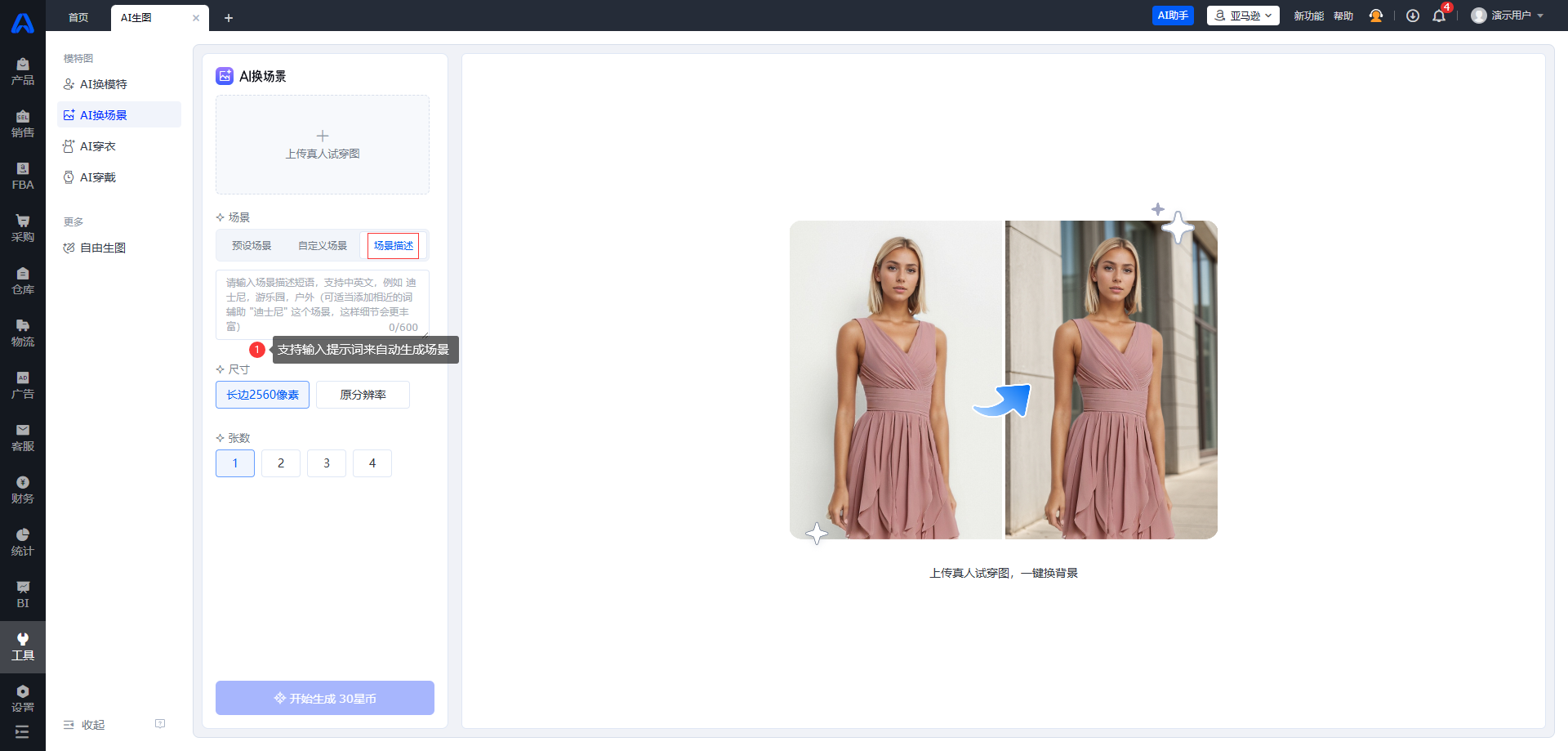 - AI换场景:上传真人试穿图,一键换场景(支持上传场景图或自定义生成场景图)