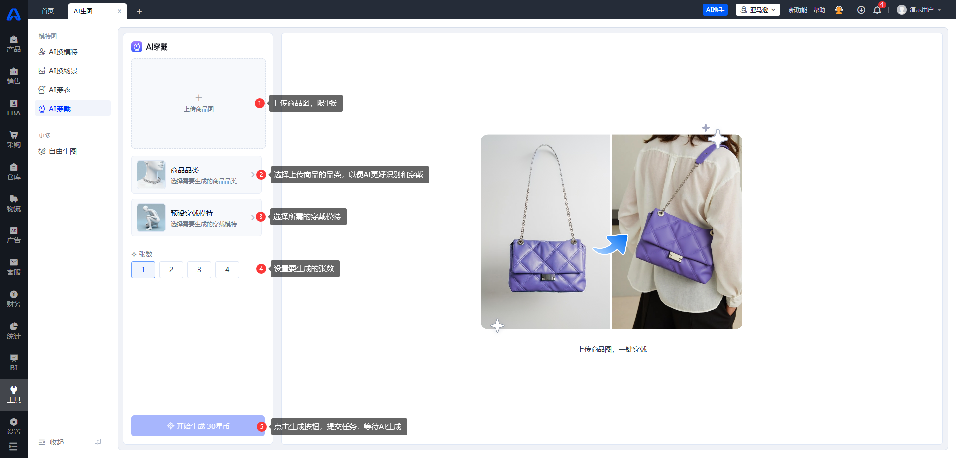 - AI穿戴:上传产品拍摄图,免抠图,可以一键将鞋子、箱包、眼镜、帽子、首饰等穿在模特身上,节省布景拍摄成本;