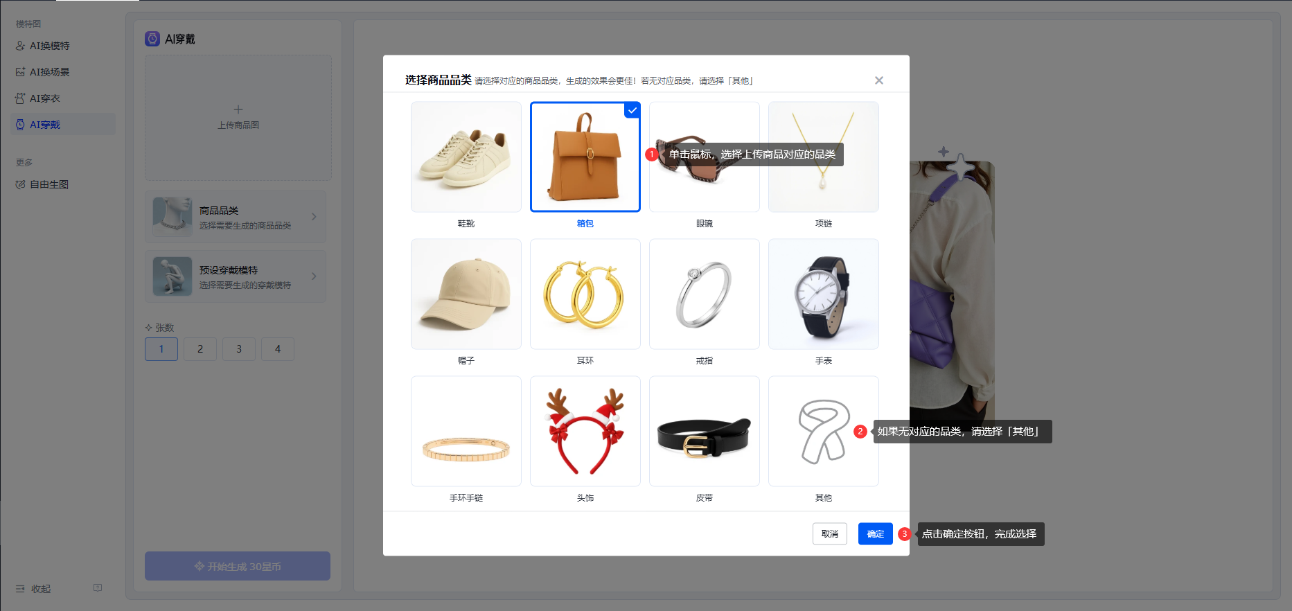 2)选择商品品类:上传图片完成后,点击选择正确的商品品类,生成的效果会更佳!若无对应品类,则选择「其他」即可;