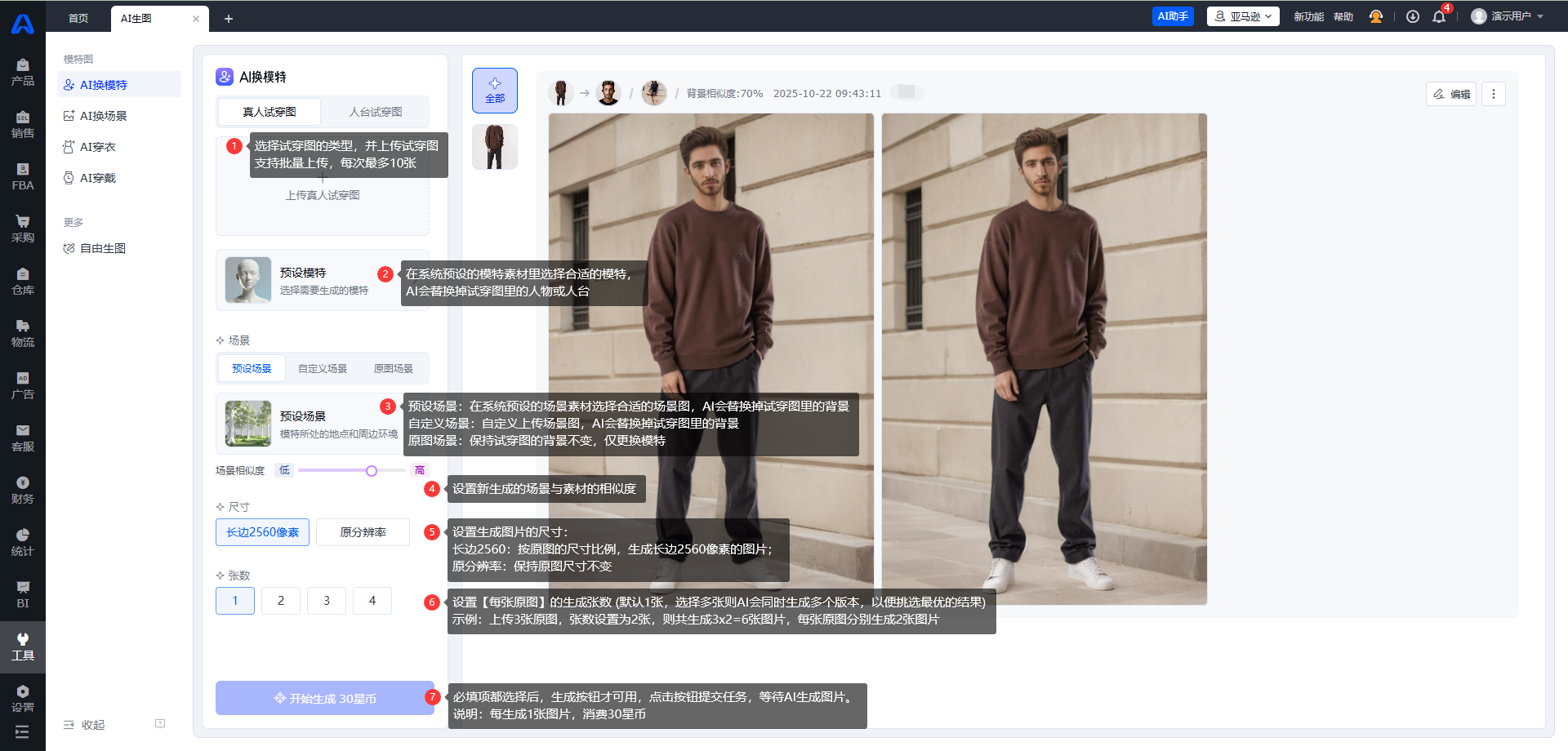 2)AI换模特/AI换场景/AI穿衣/AI穿戴:按生成的总张数计费的,每生成1张图片消费30星币,生成失败不扣费;