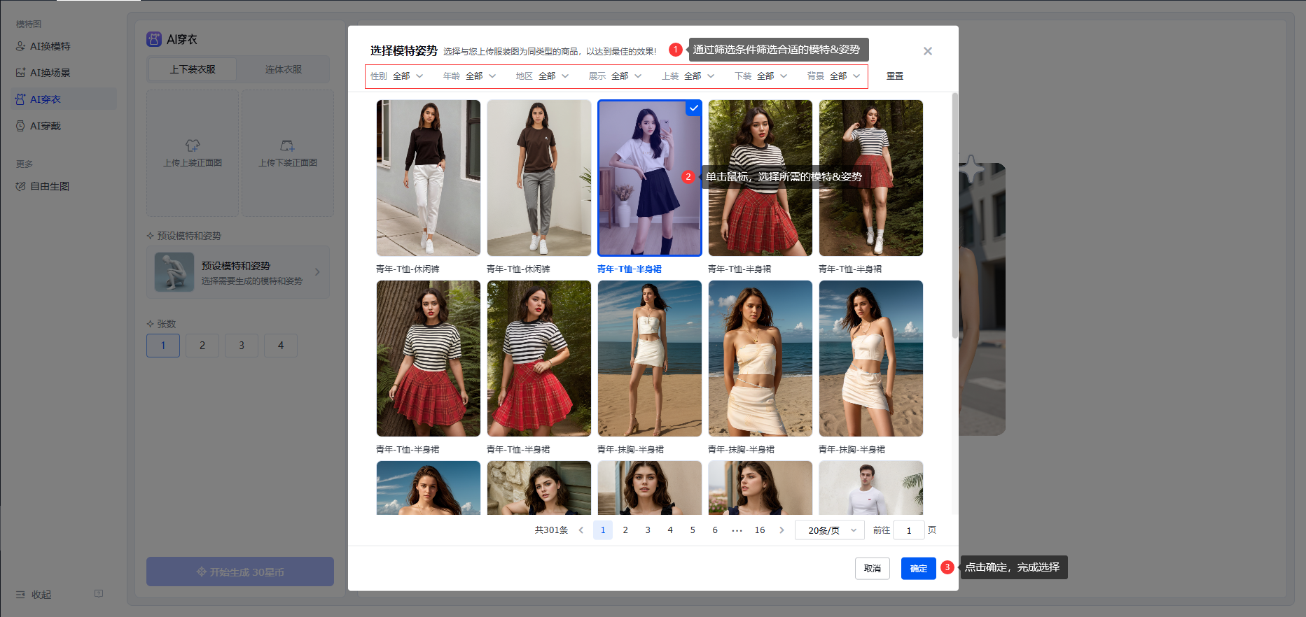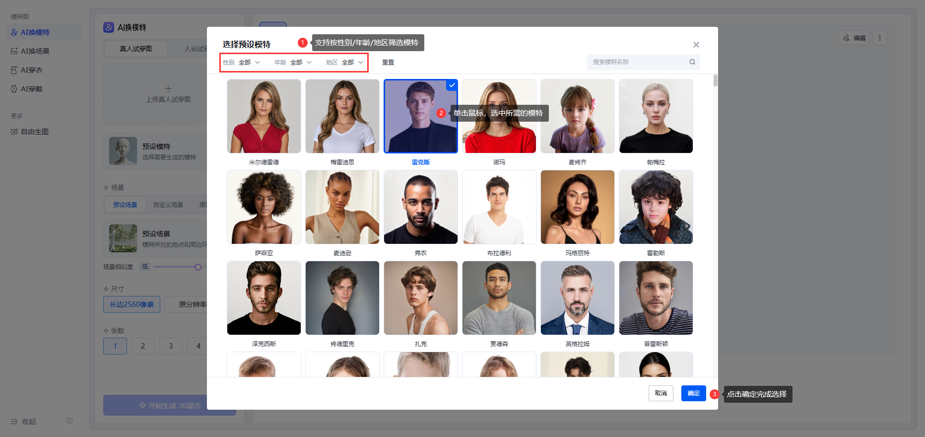 3)选择预设模特:系统预设丰富的模特素材,支持按性别/年龄/地区筛选,选择所需的模特,AI会替换掉试穿图里的人物或人台;