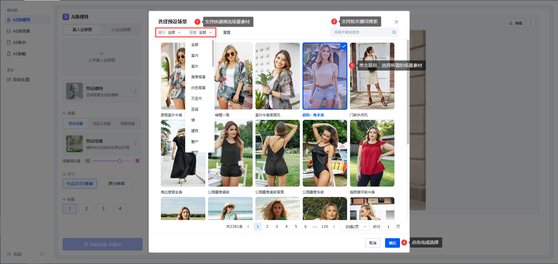 - 预设场景:系统预设丰富的场景素材,可快速选择使用,AI会替换掉原图里的场景;