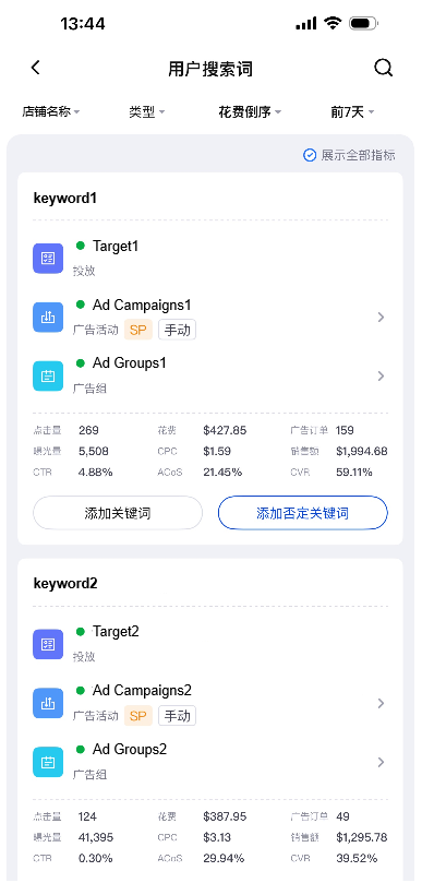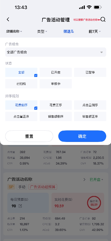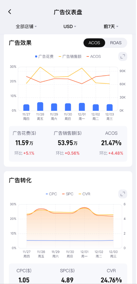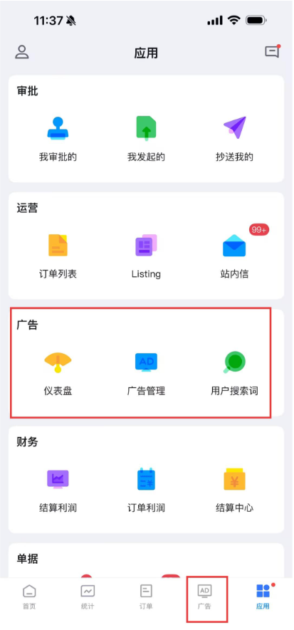 一、功能介绍 支持广告仪表盘、广告活动管理 和 用户搜索词管理。 目前只支持亚马逊平台。 二、操作说明 1.功能入口 底部菜单栏可以进入广告活动管理页面;在应用页面可以进入广告仪表盘、广告活动 和 用户搜索词页面。 2.广告仪表盘 支持看广告效果、广告转化、曝光点击、广告活动TOP10 3.广告管理 支持搜索店铺、广告活动类型、广告组合、状态、排序规则、时间范围; 支持开启/暂停广告 和 调整预算。 4.用户搜索词 可以查看用户搜索词消息和各项广告指标。