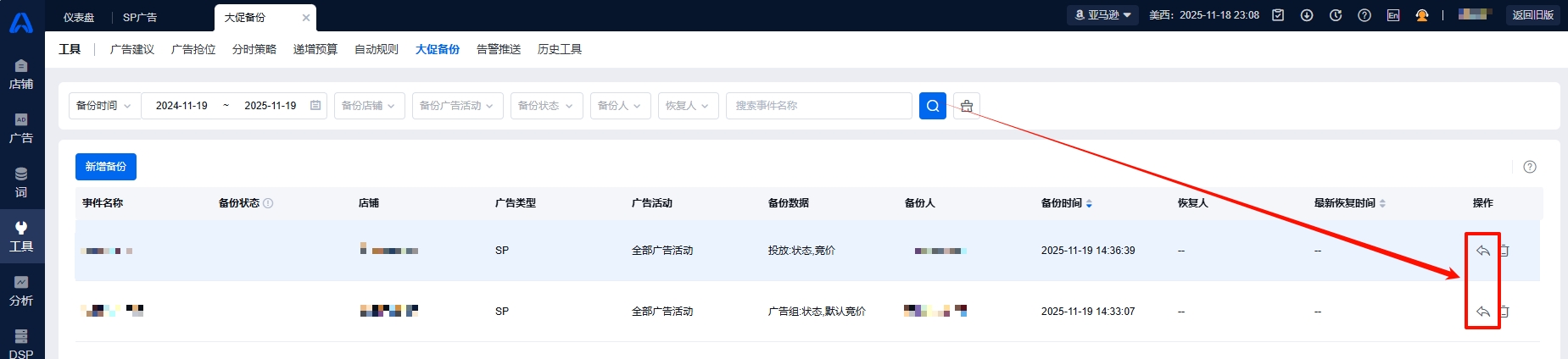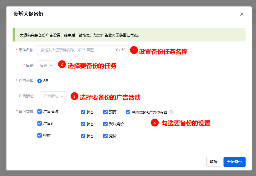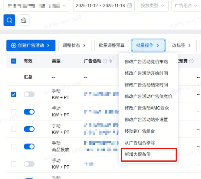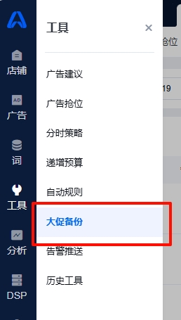 2.开通功能后,您可以选择直接在【活动管理】勾选广告活动并创建备份,或者进入【工具>大促备份】创建备份;