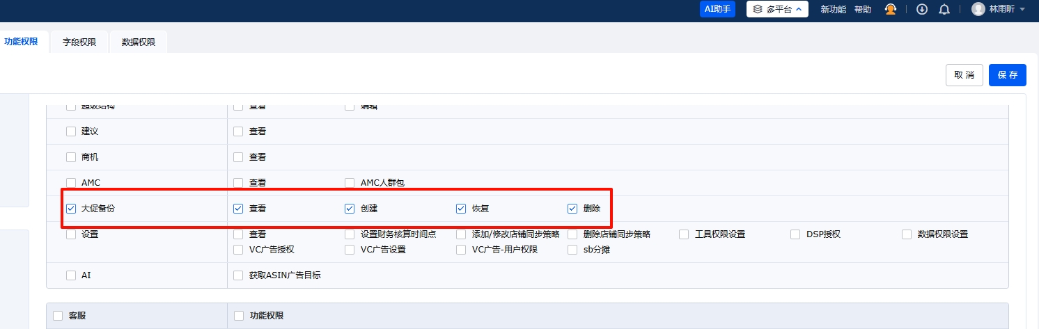 1.首次使用此功能前,需要管理员账号在【角色管理>功能权限>大促备份】中开通权限;
