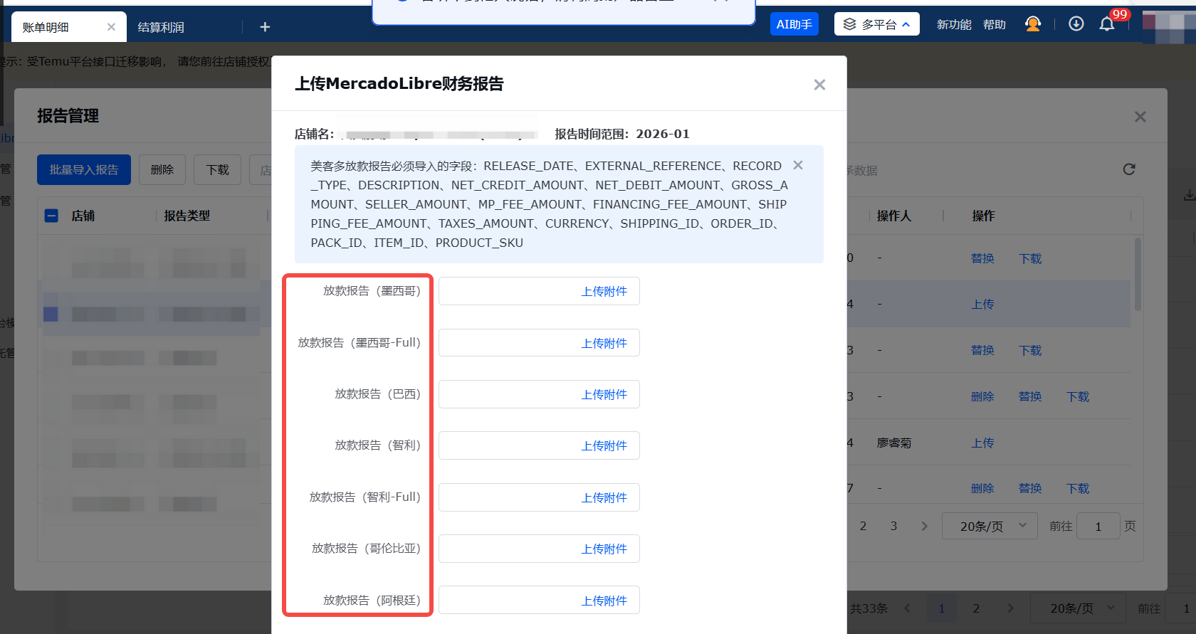 备注:美客多跨境店上传报表时,需要按照实际需求导入各个站点的报表。