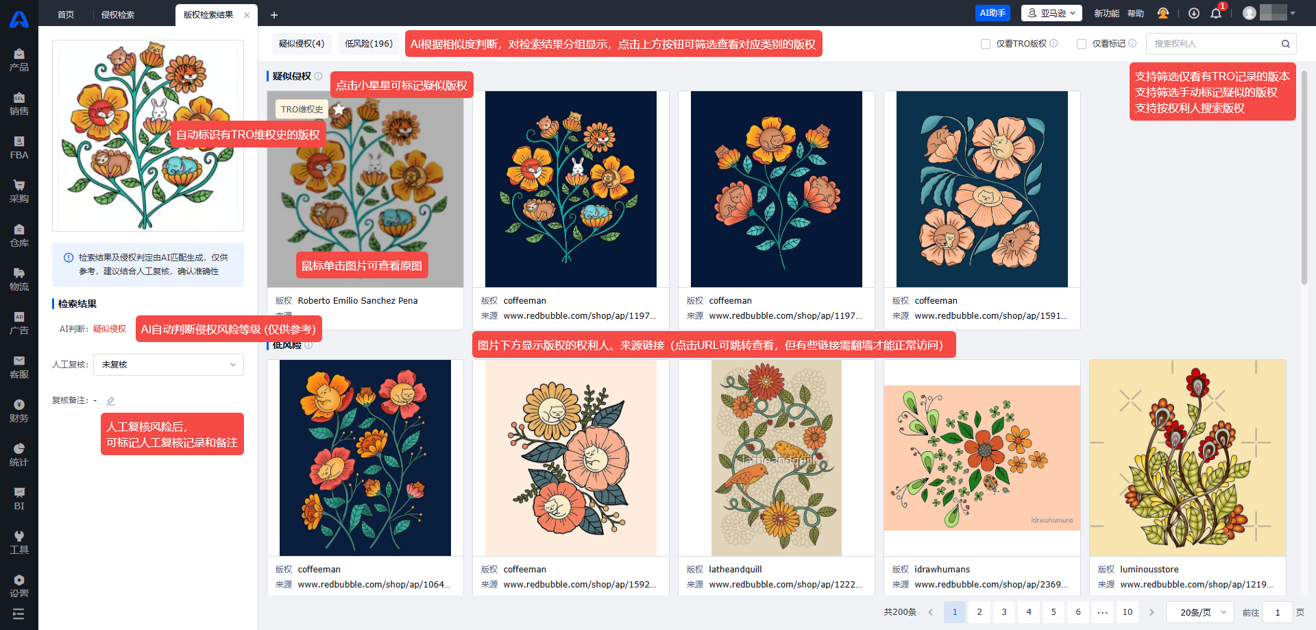版权检索:上传图案,一键检索全球版权数据,AI判断侵权风险,自动标识TRO版权,规避版权侵权。