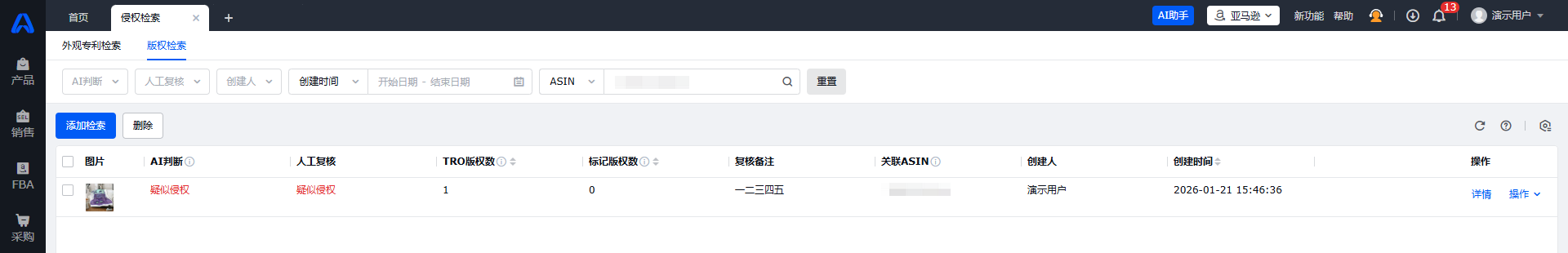 直接在【侵权检索 > 版权检索】页面新建的任务,关联ASIN默认为空;