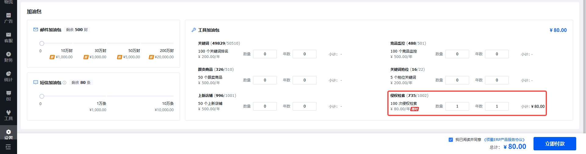 打开【设置模块>产品套餐】页面,在工具加油包里找到【侵权检索】,添加要购买的次数,最后提交付款即可;