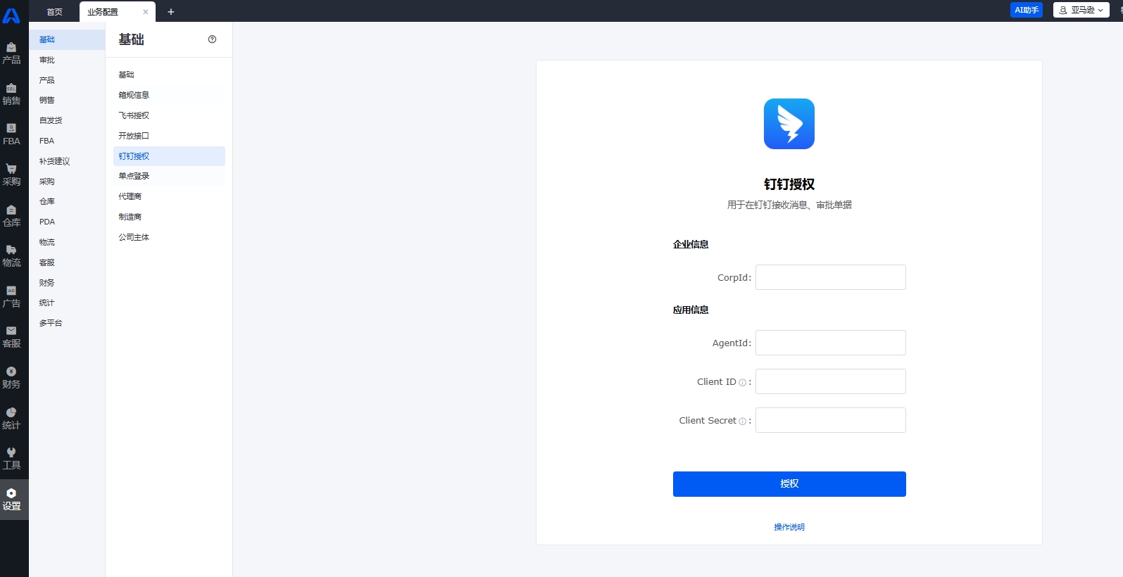 打开领星ERP,进入“设置-业务配置-全局-钉钉授权”页面,填写钉钉的企业及应用信息,该信息在以下页面获取:钉钉开放平台(https://open-dev.dingtalk.com/)的“应用信息”页面。