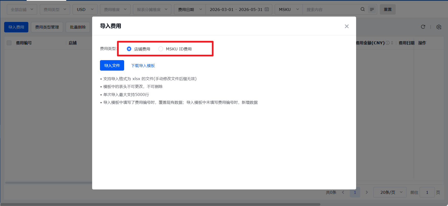 导入费用时,请按照对应的费用类型下载模板。