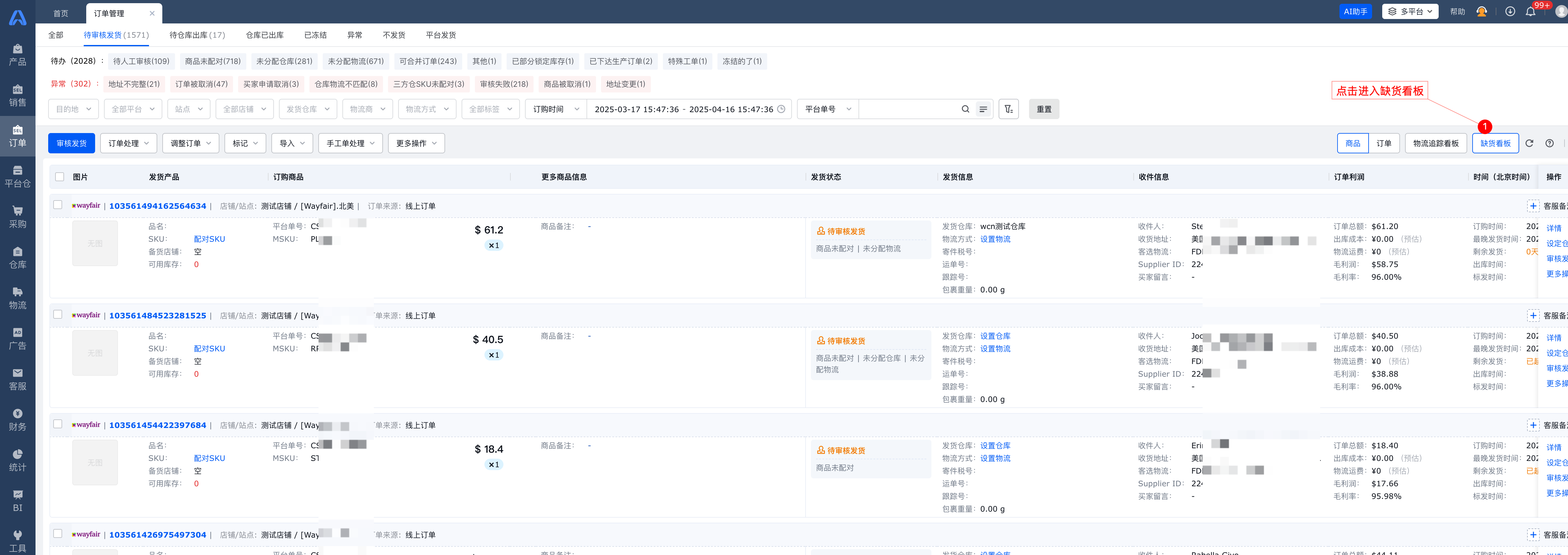 在订单管理页面,点击列表右上角的[缺货看板]入口,打开 缺货看板 页面