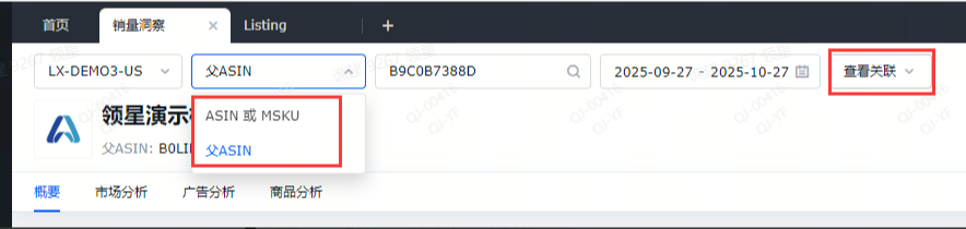 1、ASIN查询:选择指定店铺、输入ASIN/MSKU或父ASIN进行模糊查询,查询后选择单个ASIN、查看该ASIN在所选择时间段内的销量洞察详情;