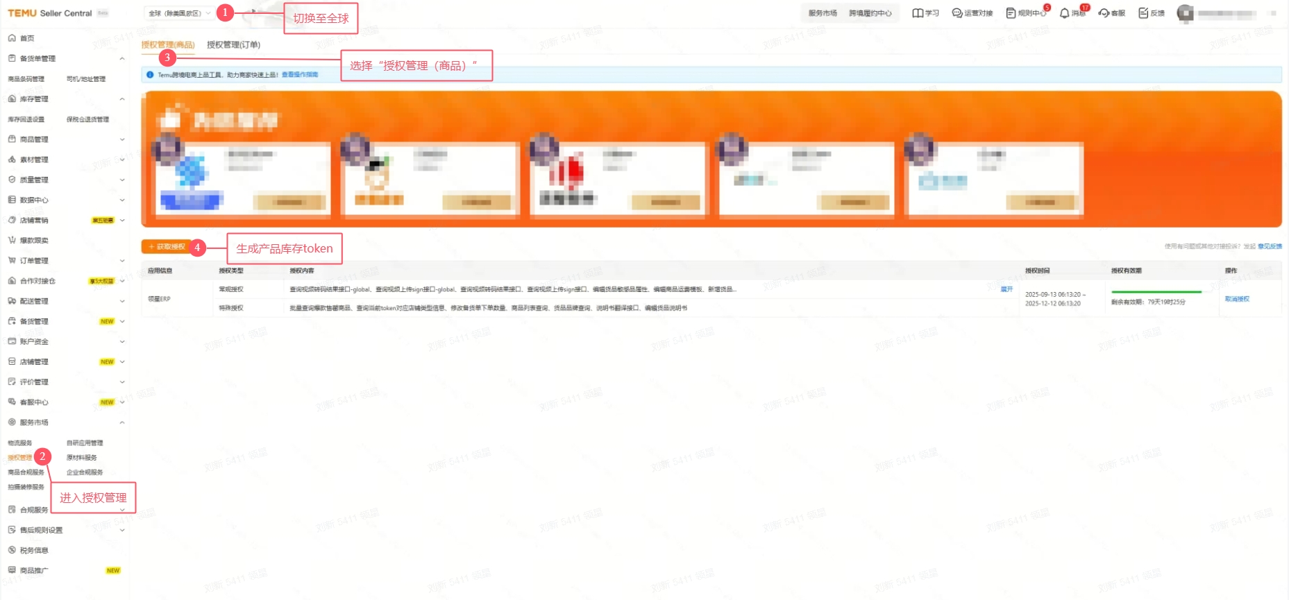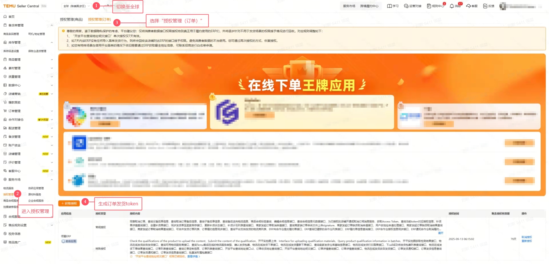 进入Temu店铺后台的Seller Center的授权管理页面,选择授权管理(商品),点击获取授权,选择“领星ERP”生成获取店铺access token并复制到领星ERP中进行授权,请授权全部功能。