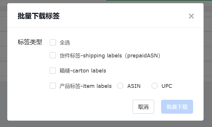 选择批量下载标签,可以将该货件的shipping labels、carton labels、item labels(根据选择)打包一起下载