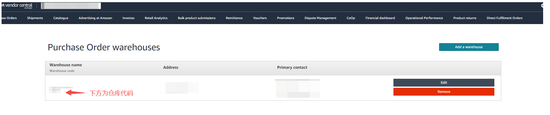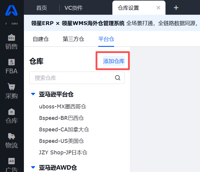 设置-仓库设置,在亚马逊平台仓(VC)中找到对应仓库,点击编辑配对,配对系统内仓库,填写地址代码(亚马逊接口要求必填,否则无法创建货件)