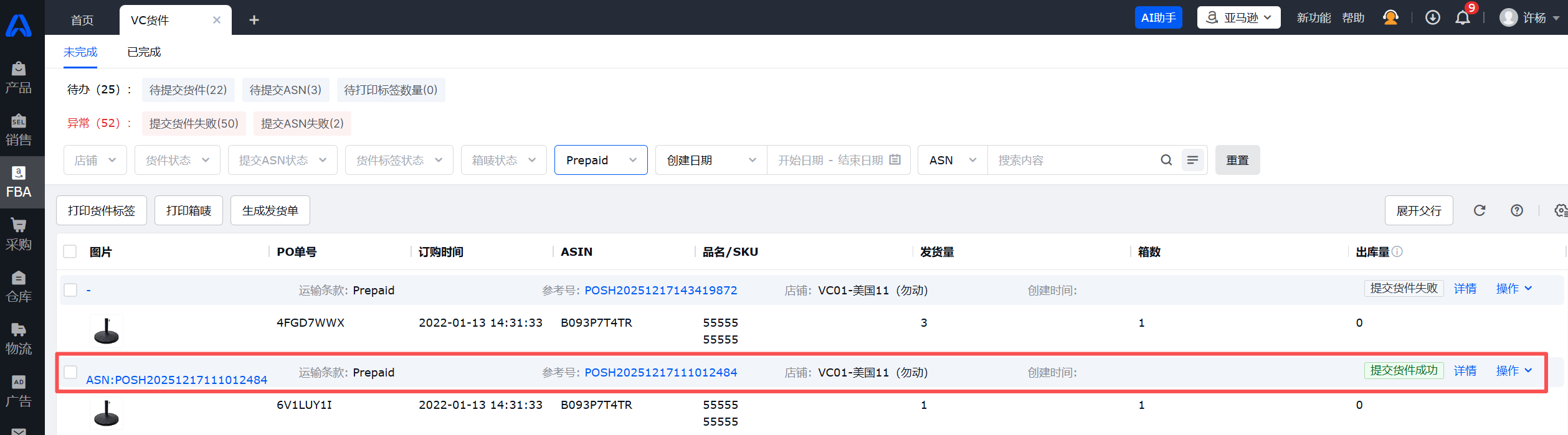 可在FBA-VC货件查看提交状态,显示提交货件成功,即提交PrepaidASN成功