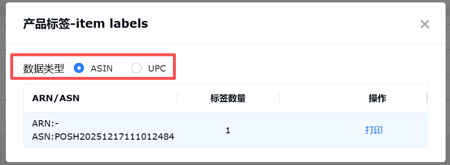 在货件详情打印时,可以打印产品标签,需要确认打印的数据类型,此处的ASIN/UPC数据直接取自VC-Listing中的数据