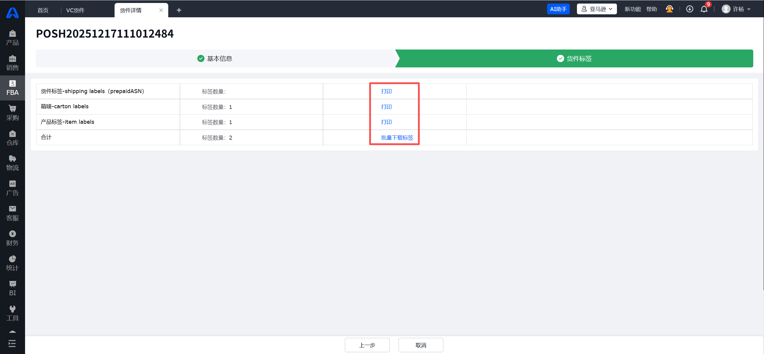 ④点击提交后数据将上传亚马逊,可在FBA-VC货件页面查看货件状态。待亚马逊生成shipping label后,货件标签状态变为“已生成,即可打印shipping label