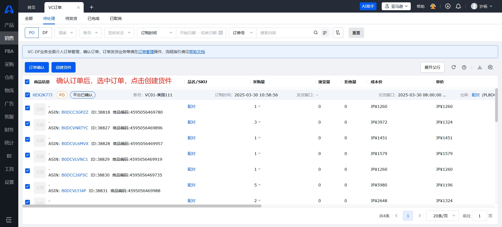 允许,在VC订单页面选中该订单中要创建的ASIN即可