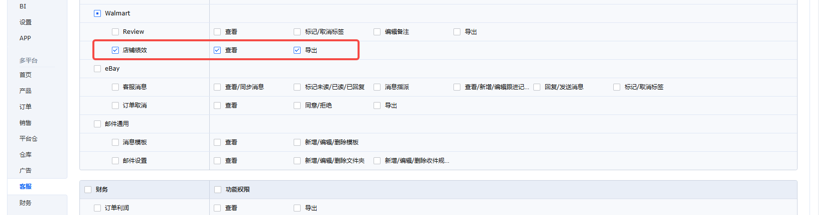 功能权限:在角色管理开启【多平台>客服>Walmart>店铺绩效】的"查看、导出"权限
