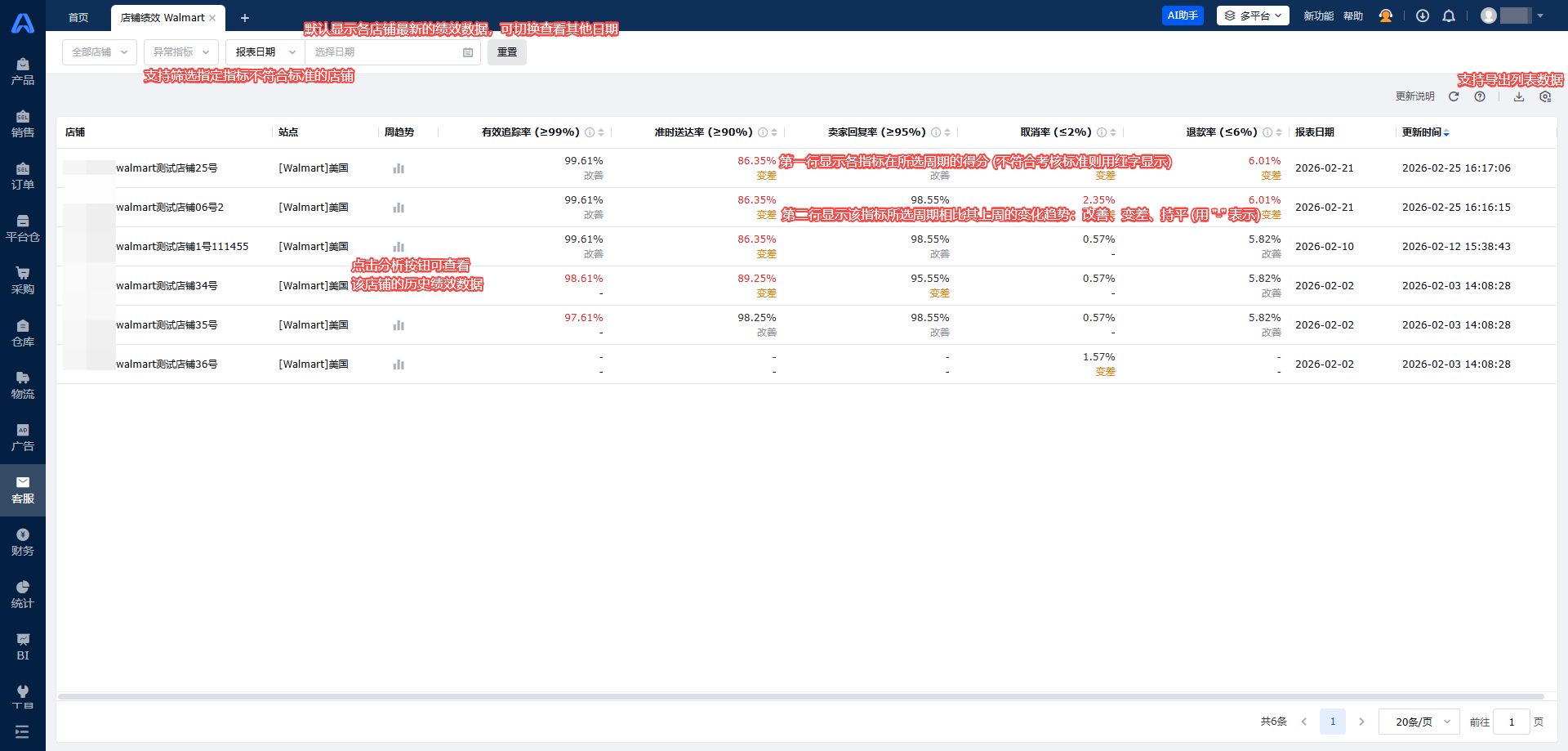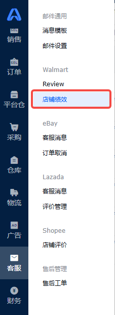 功能入口:多平台 > 客服模块 > Walmart > 店铺绩效
