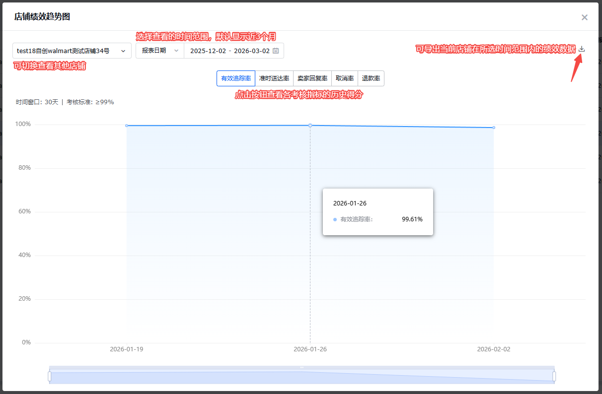 展示沃尔玛美国站各店铺的Seller Performance,包括"有效追踪率、准时送达率、卖家回复率、取消率、退款率"这5个指标的得分&变动趋势,以及支持查看各店铺在历史各周的变化趋势。