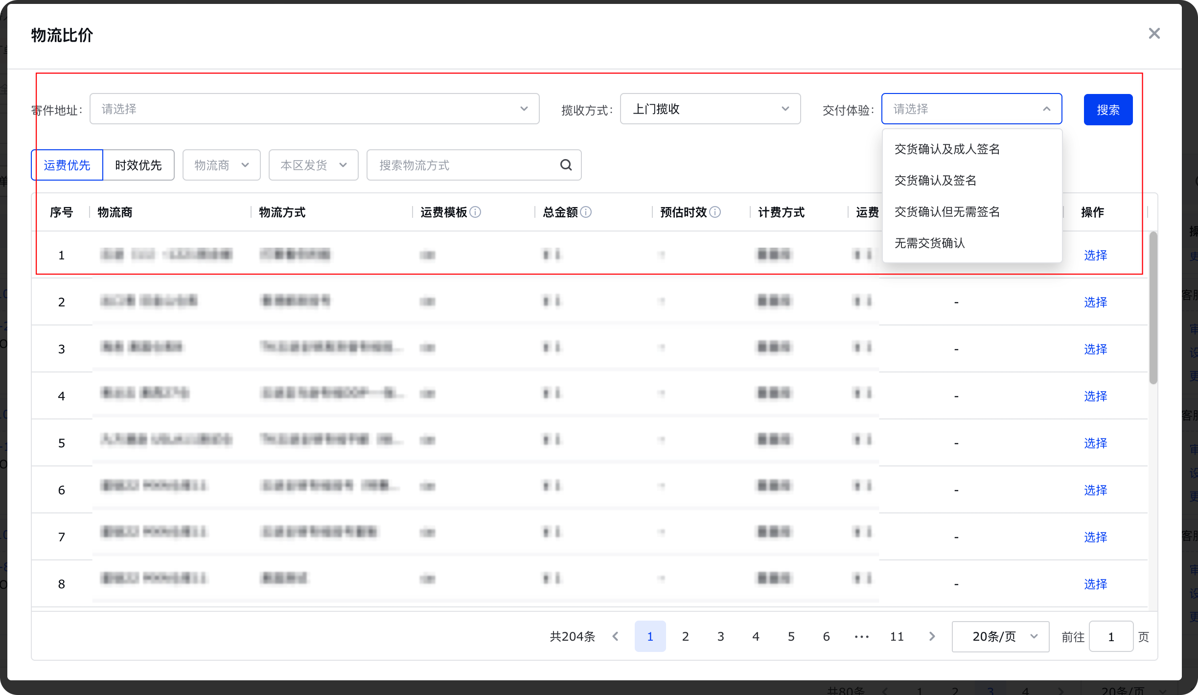 - 在【物流比价】设置对应的揽收方式和交互体验及寄件地址,点击【搜索】即可完成【SHIP+】的比价操作,如此渠道支持【Ship+】可以查看对应的标签