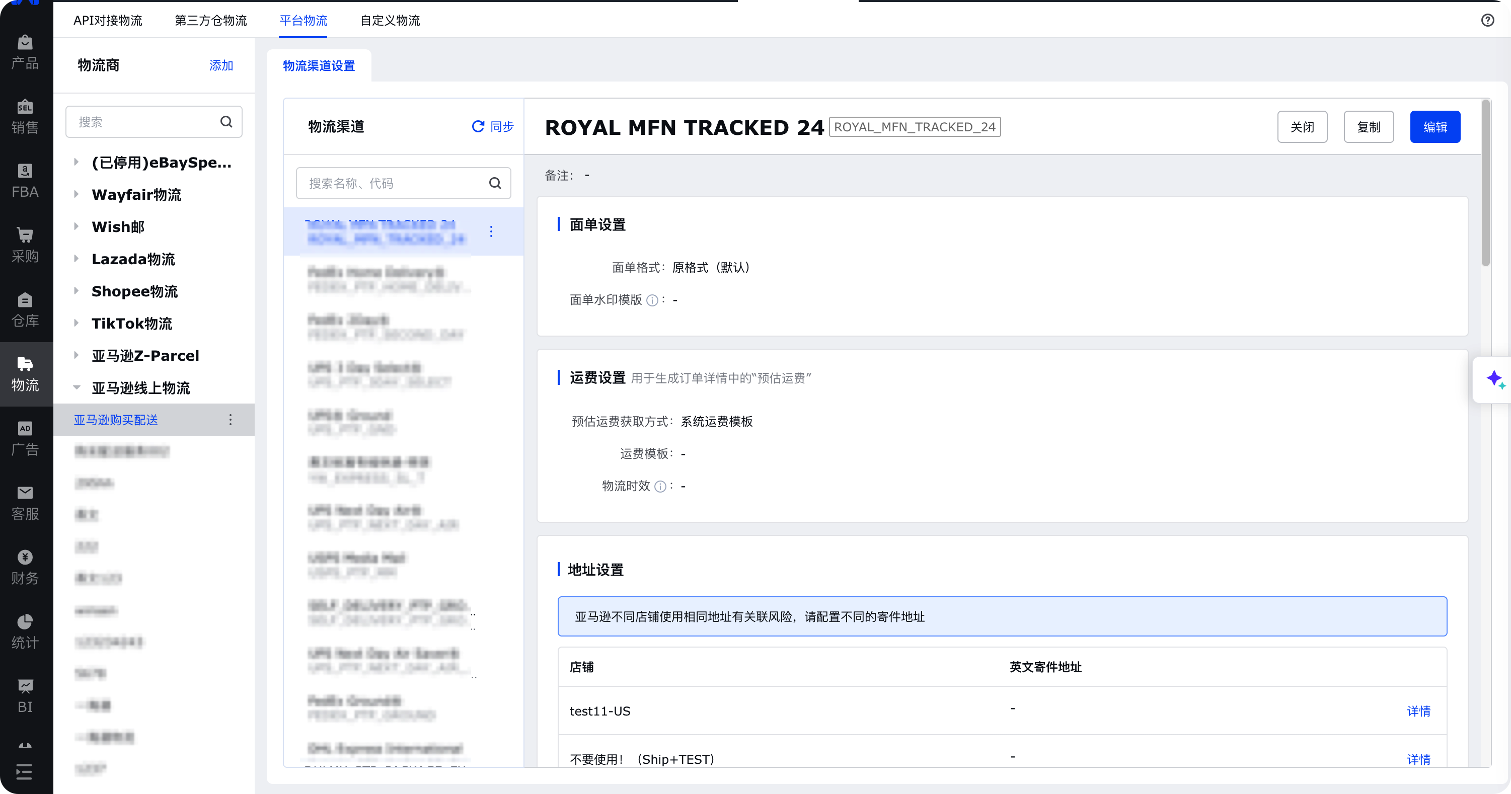 - 进入【物流】-【物流管理】模块,切换至【平台物流】,点击添加物流商【亚马逊亚马逊线上物流】;