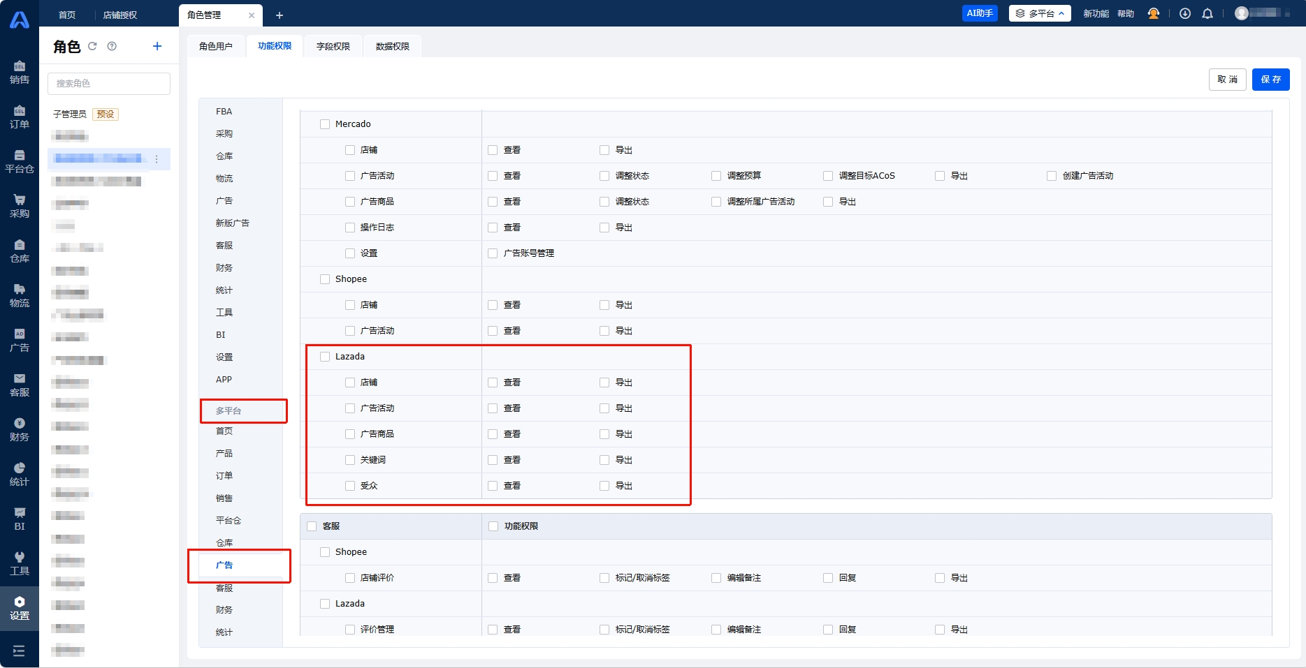 2.该账号有多平台>设置>角色管理>功能权限>Lazada广告对应的页面权限