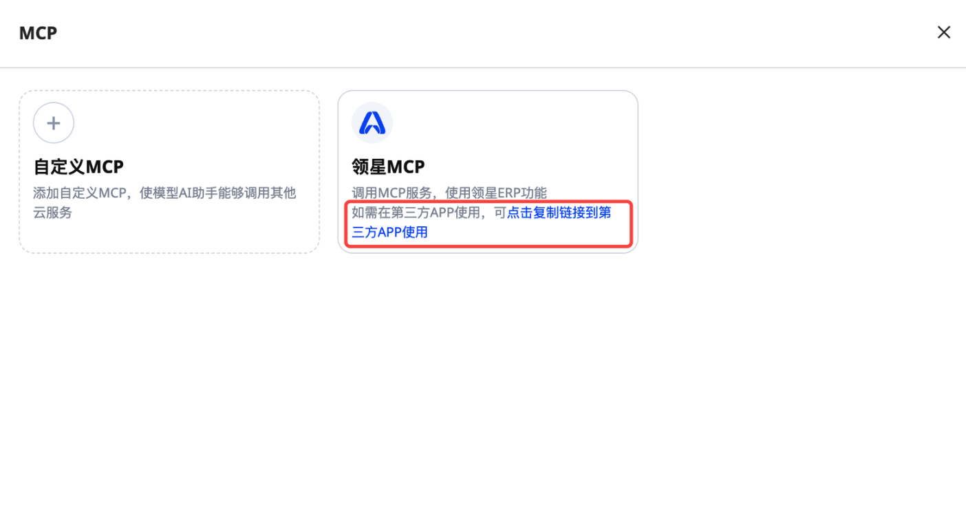 如需把领星数据提供给第三方应用使用,可获取当前帐号权限的MCP请求地址: