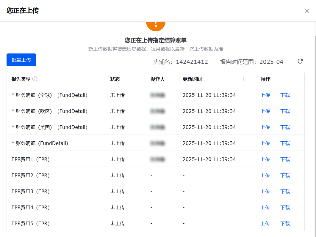 您需要再对应店铺的对应月的数据行中上传指定的报告,系统将自动进行解析和计算。您还可以批量导入报告,在批量导入报告时,您可以选中多个文件,一次性导入多个店铺、多个月份的数据。