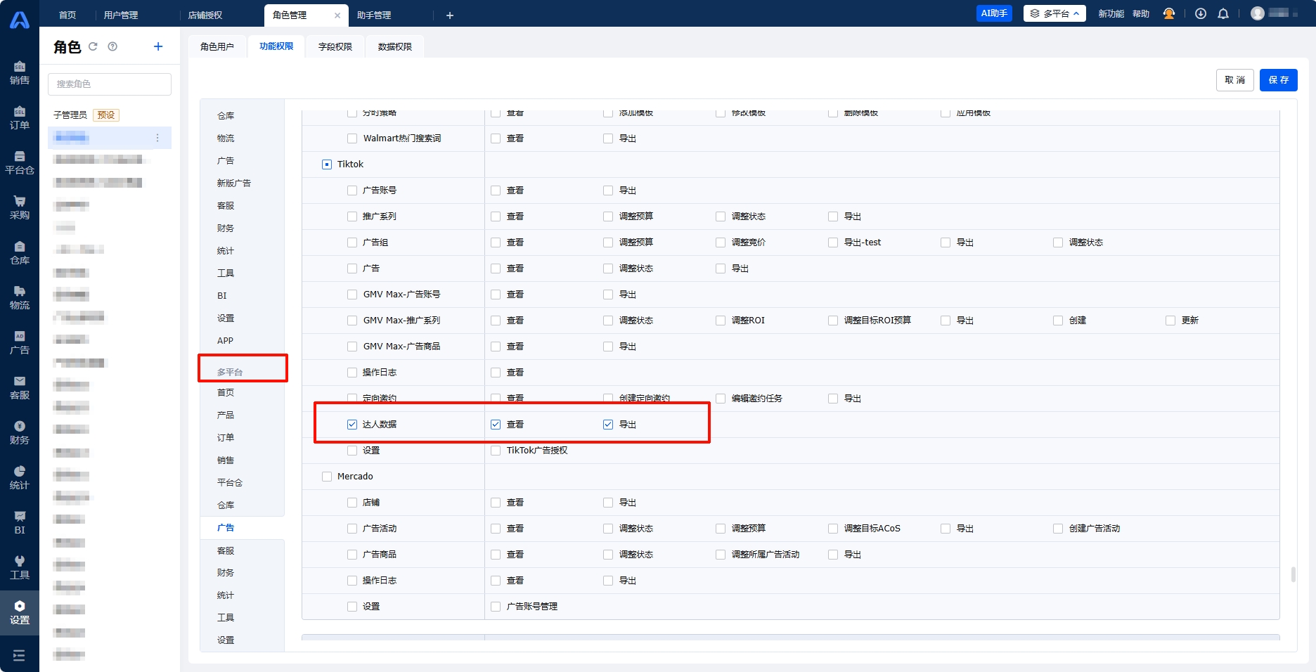 1.权限设置:首次使用本功能,需要管理员账号在【角色管理>TikTok>达人数据】中开通对应权限;