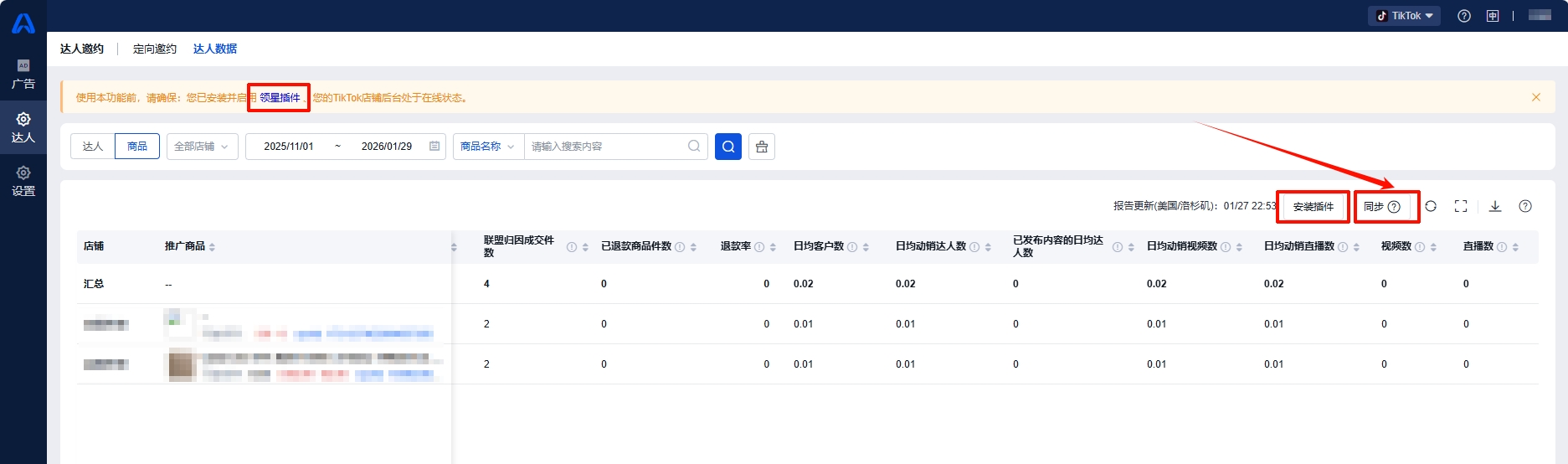 3.同步定向邀约:初次使用该功能,需在TikTok后台登录店铺、打开领星插件,并点击【同步】按钮。我们将会为您同步过去30天的达人报告数据