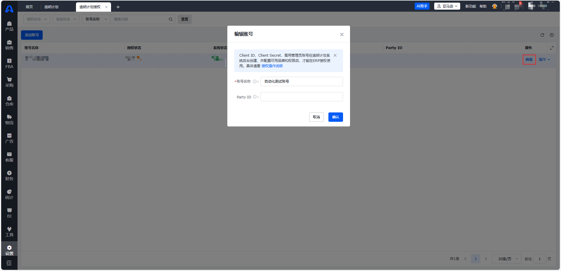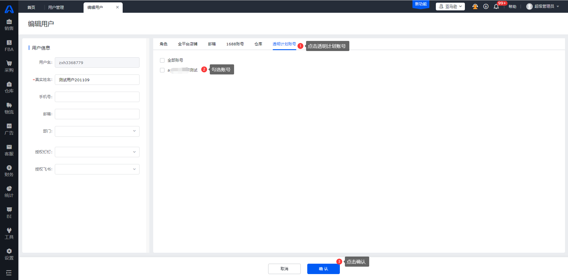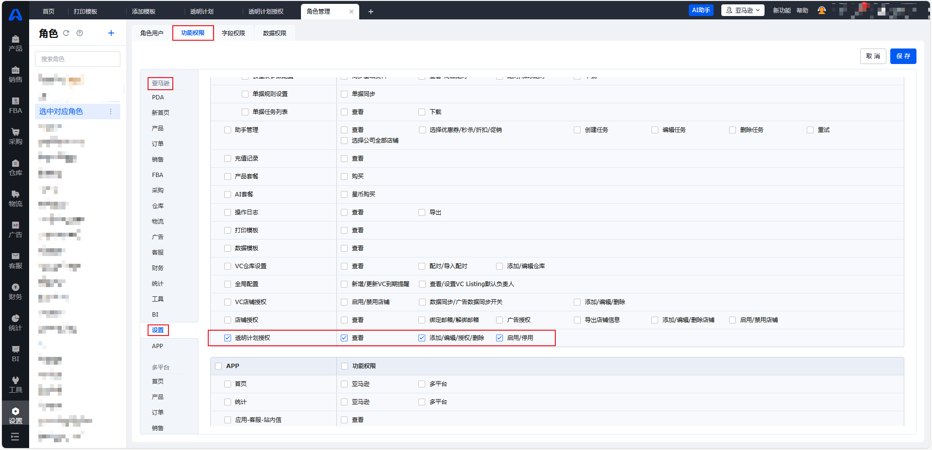 进入【设置-角色管理-选中对应角色-功能权限-(亚马逊)设置-透明计划授权】,勾选【透明计划授权】。