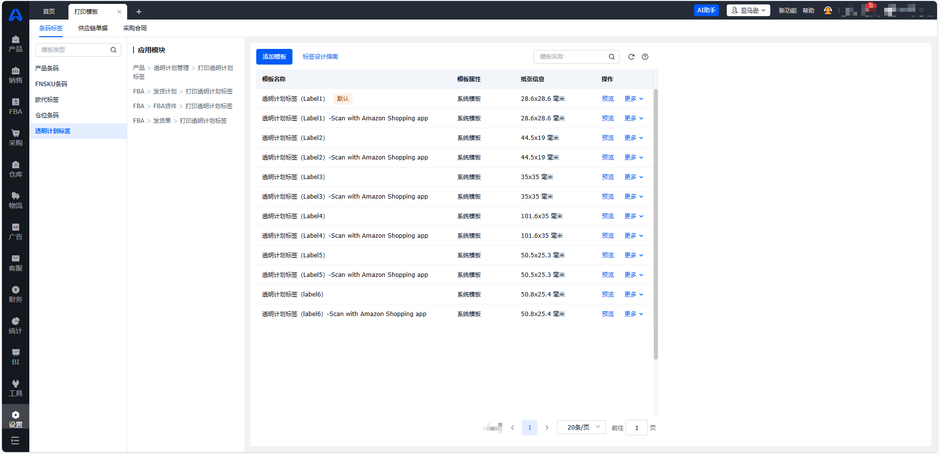 【设置-打印模板-条码标签-透明计划标签】设置了6种官方标签的系统模板,可直接使用。