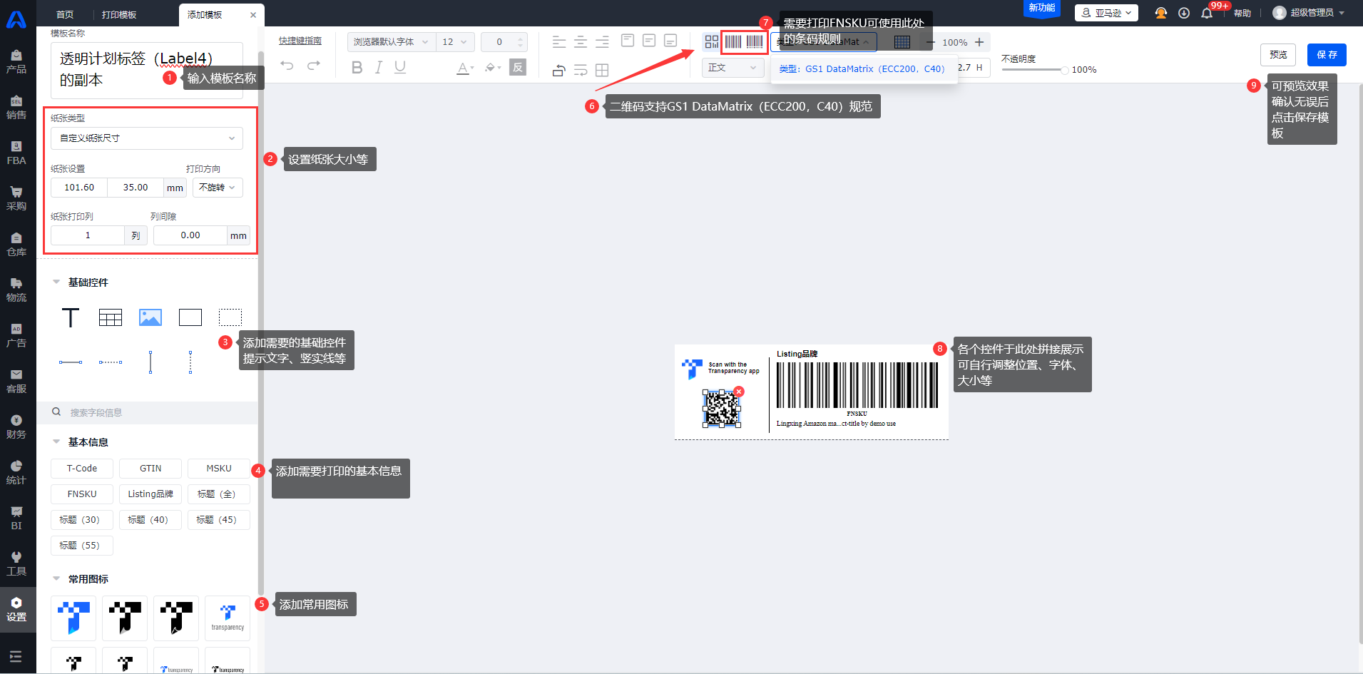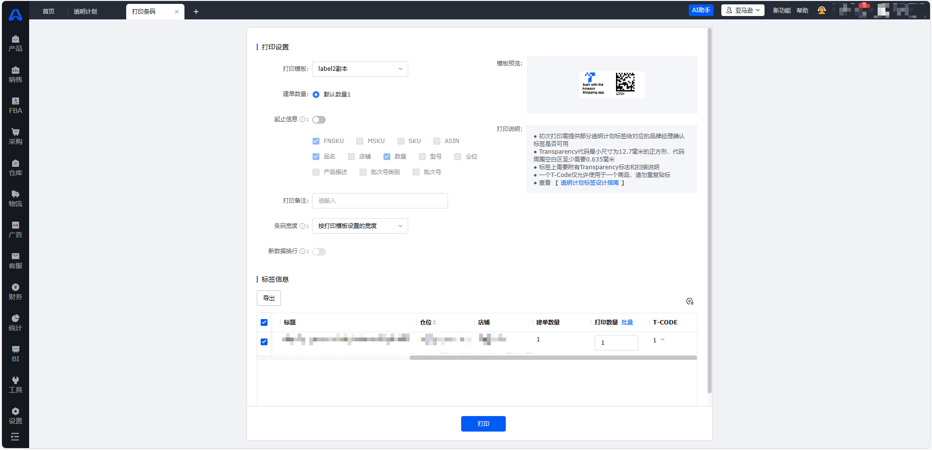 可在领星【设置-打印模板-条码标签-透明计划标签】自行设计标签,操作说明见【四、3】。