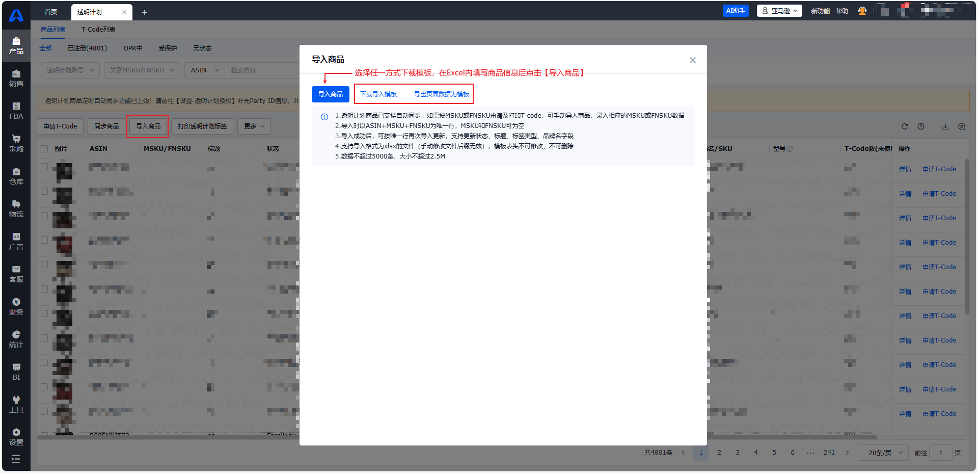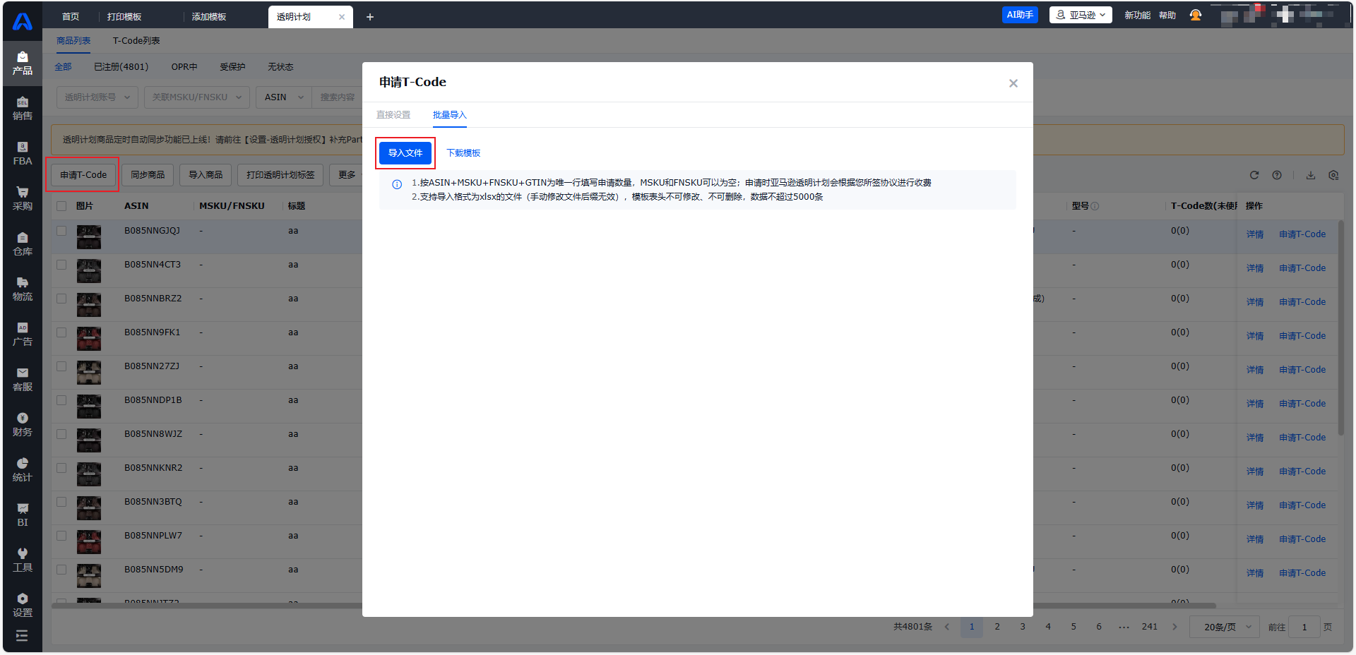 方式二:不勾选列表商品,点击【申请T-Code】,导入Excel,为商品列表已有商品批量申请T-Code