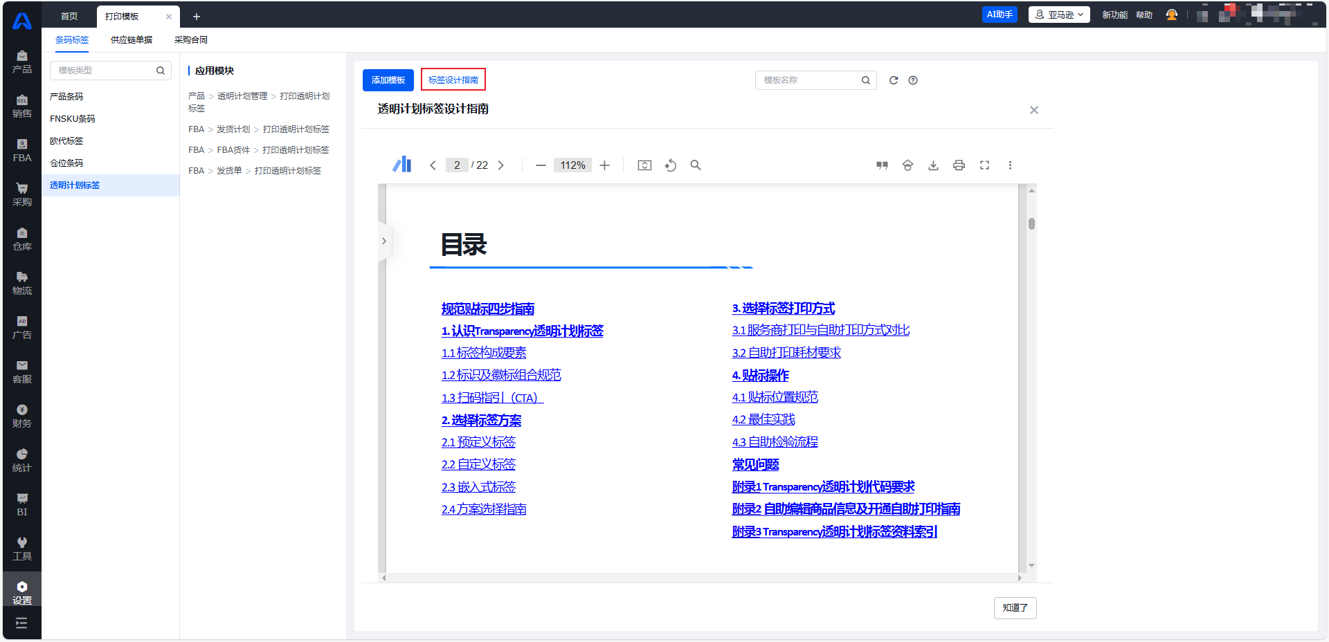 Transparency 透明计划标签设计&贴标指南:点击【设置-打印模板-透明计划标签-标签设计指南】,可预览和下载指南。请您按照规范设计标签和贴标。