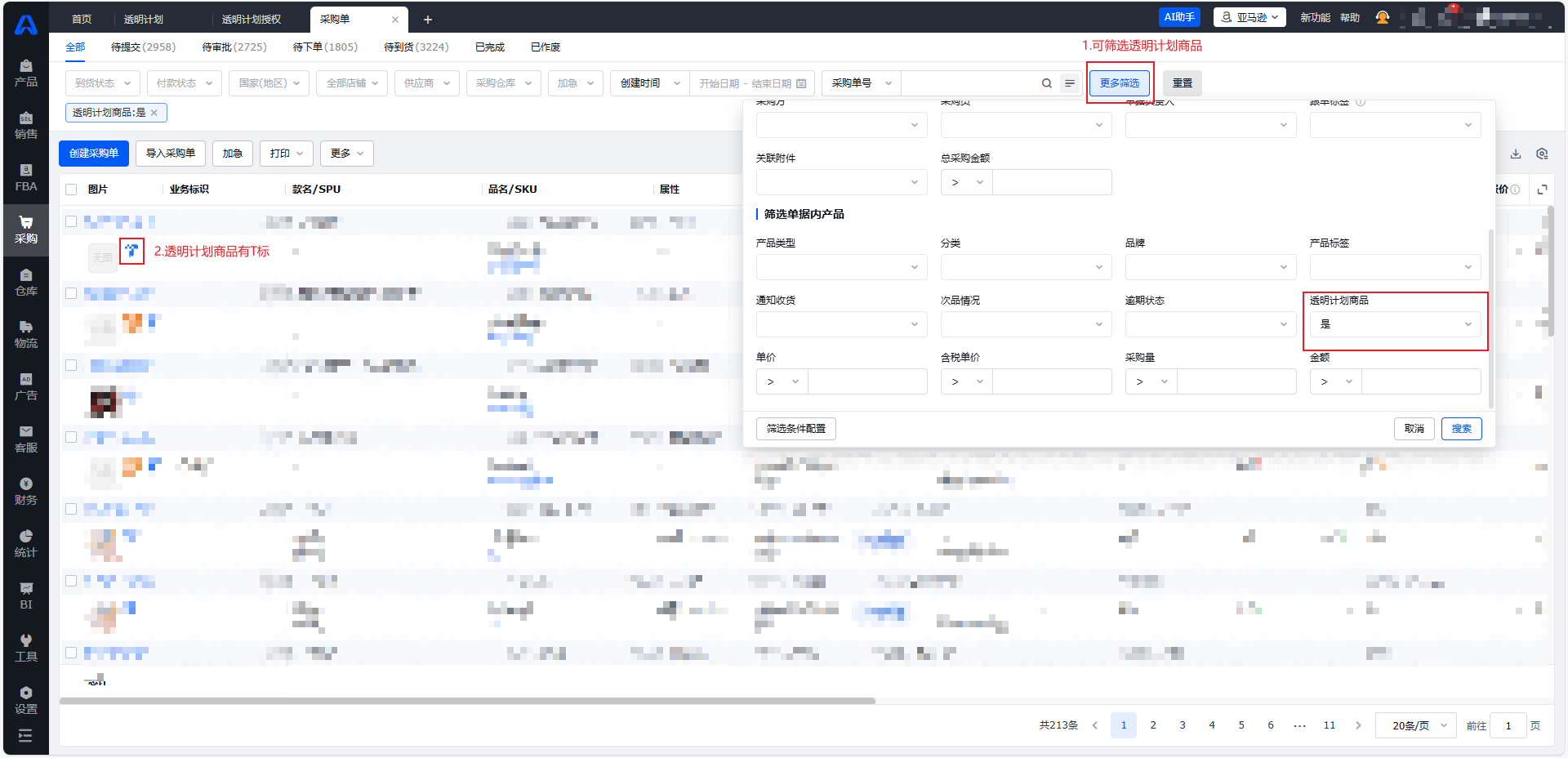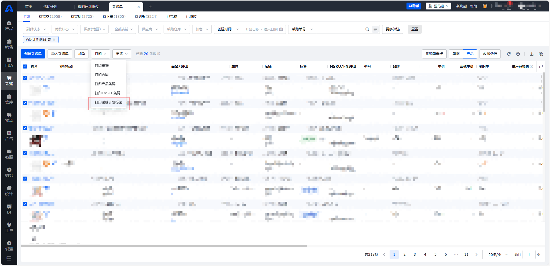 业务模块打印透明计划标签,需要勾选【设置-角色管理-选中对应角色-功能权限-(亚马逊)采购-采购单-打印透明计划标签】。