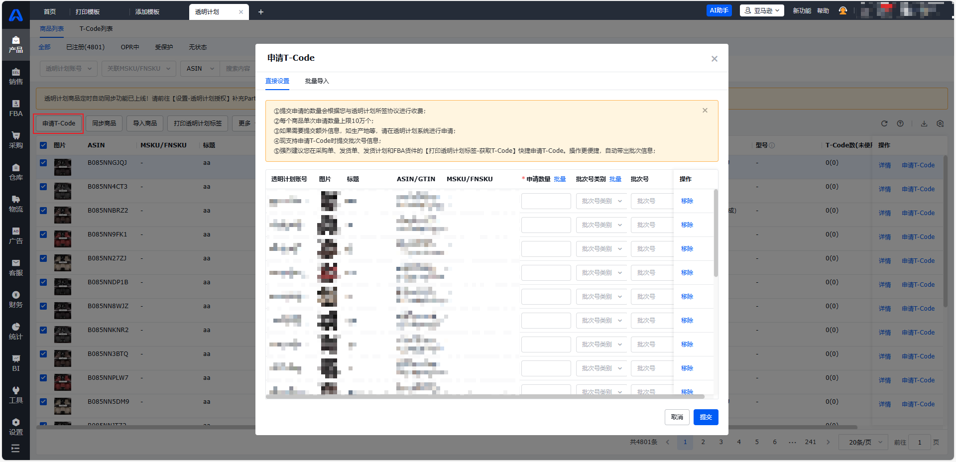方式三:勾选列表商品,点击【申请T-Code】,为勾选商品批量申请T-Code