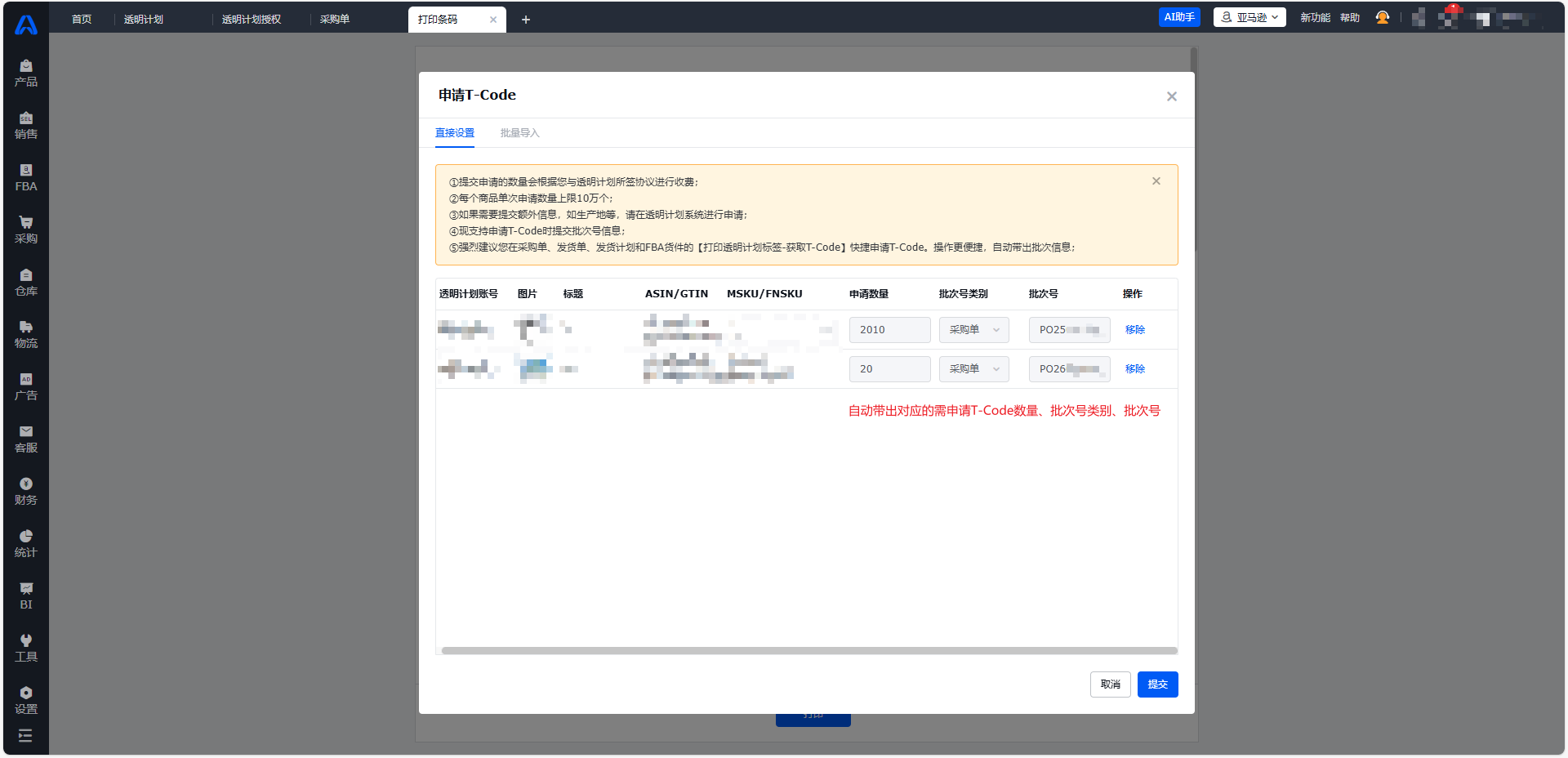 当填写的批次号类别是采购单号、发货计划号、发货单号、FBA货件号时,强烈建议您在采购单、发货计划、发货单和FBA货件的【打印透明计划标签-获取T-Code】快捷申请T-Code,可以自动带出批次信息。操作说明见【四、4&5】