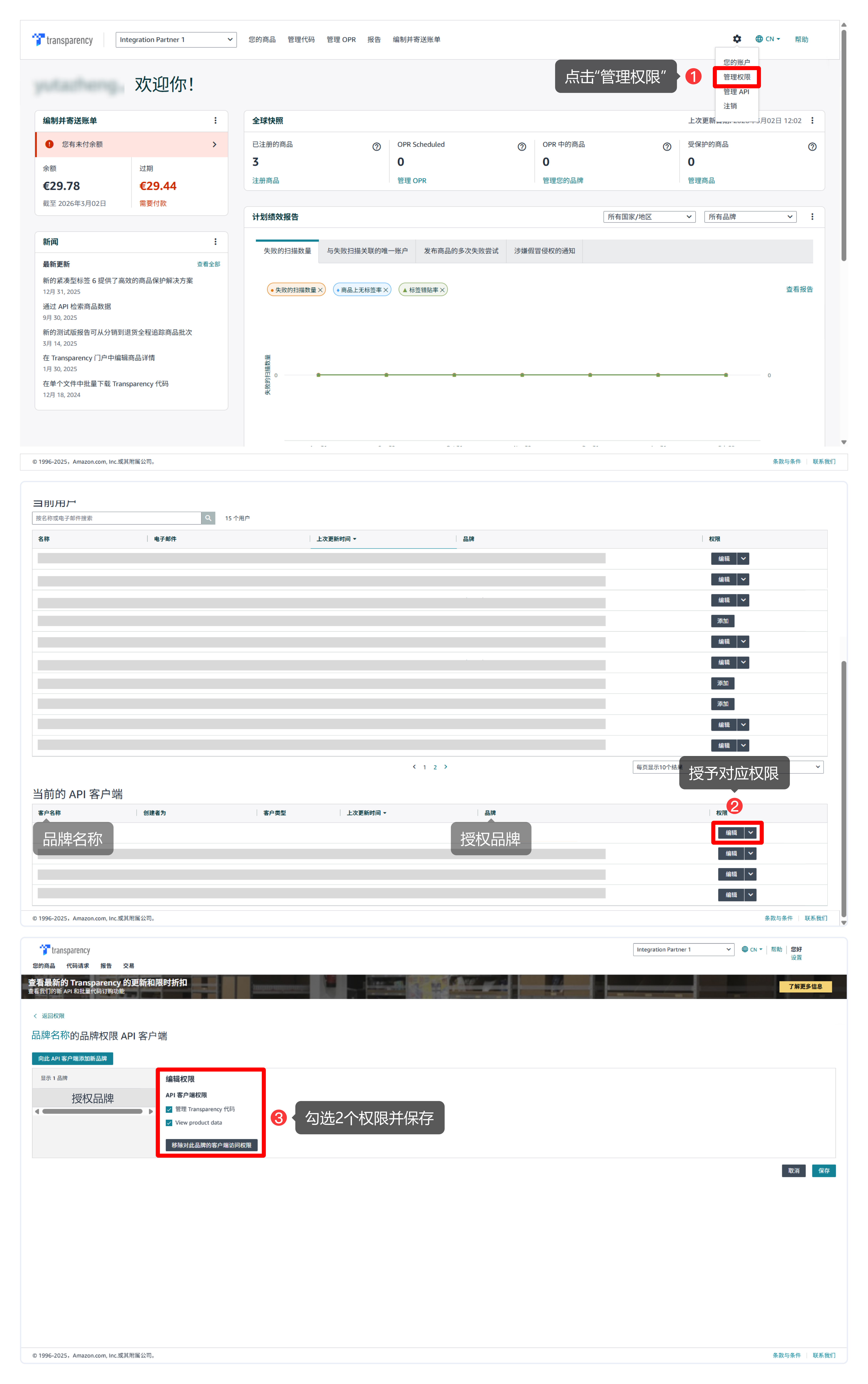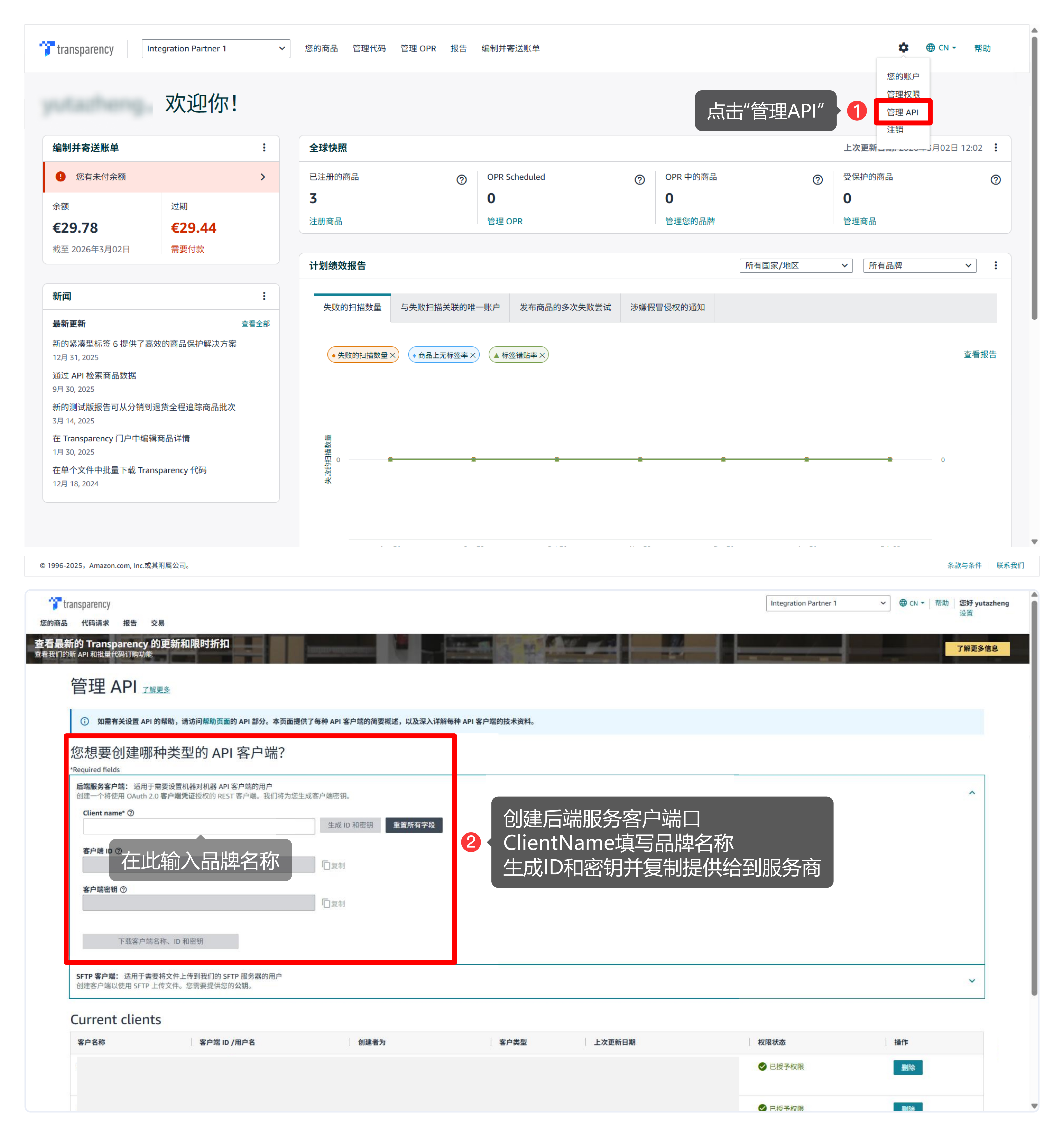 - 一个Transparency透明计划账户最多可申请4个Client,【Client name】删除后将不能通过API下载透明计划标签,请谨慎处理。