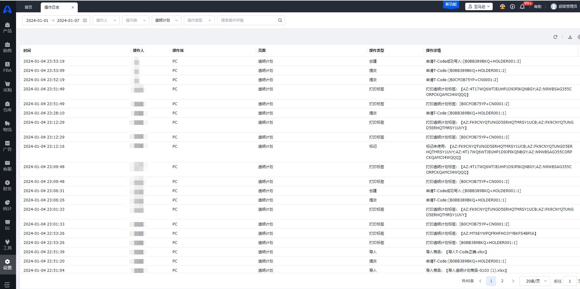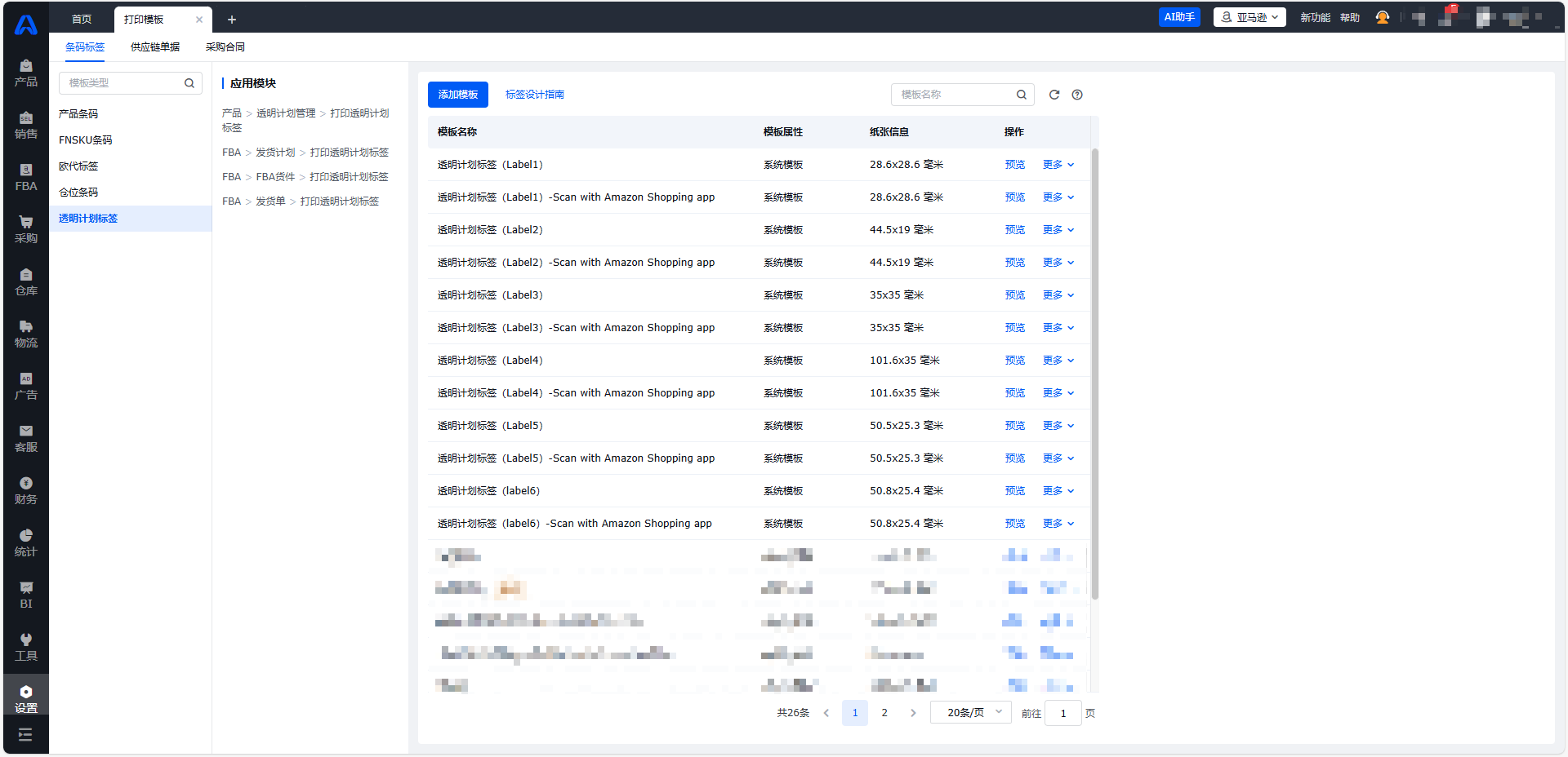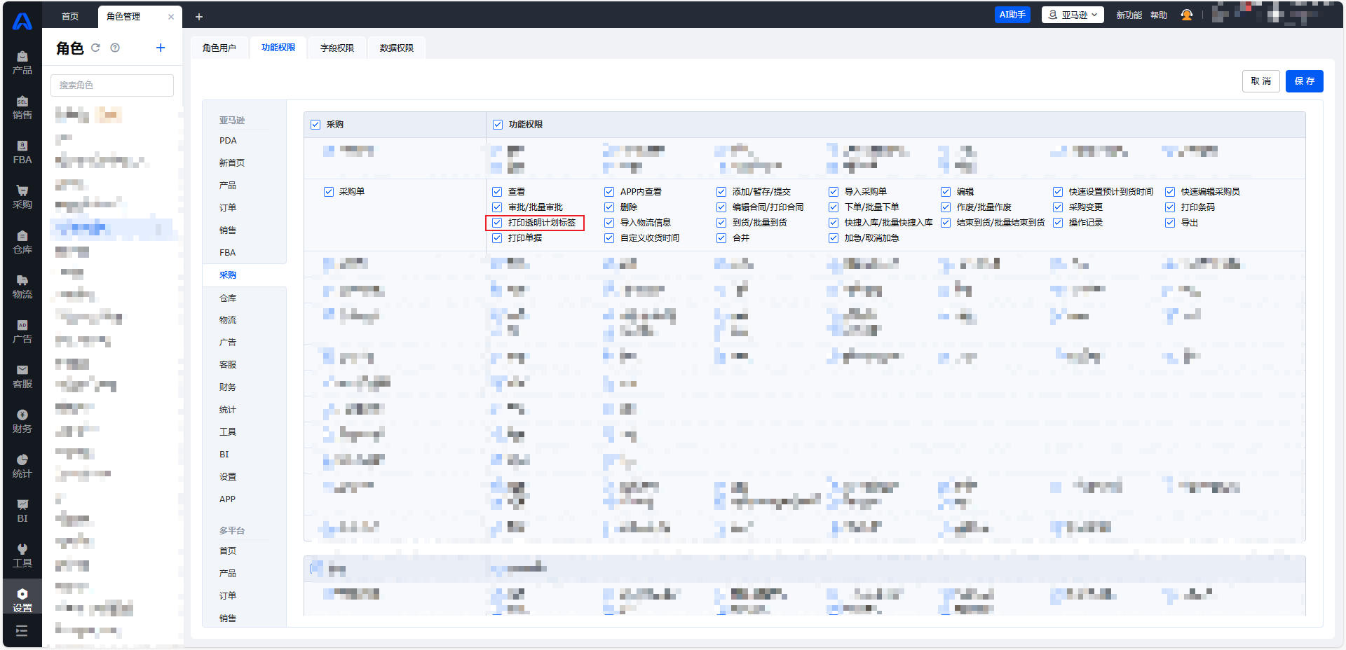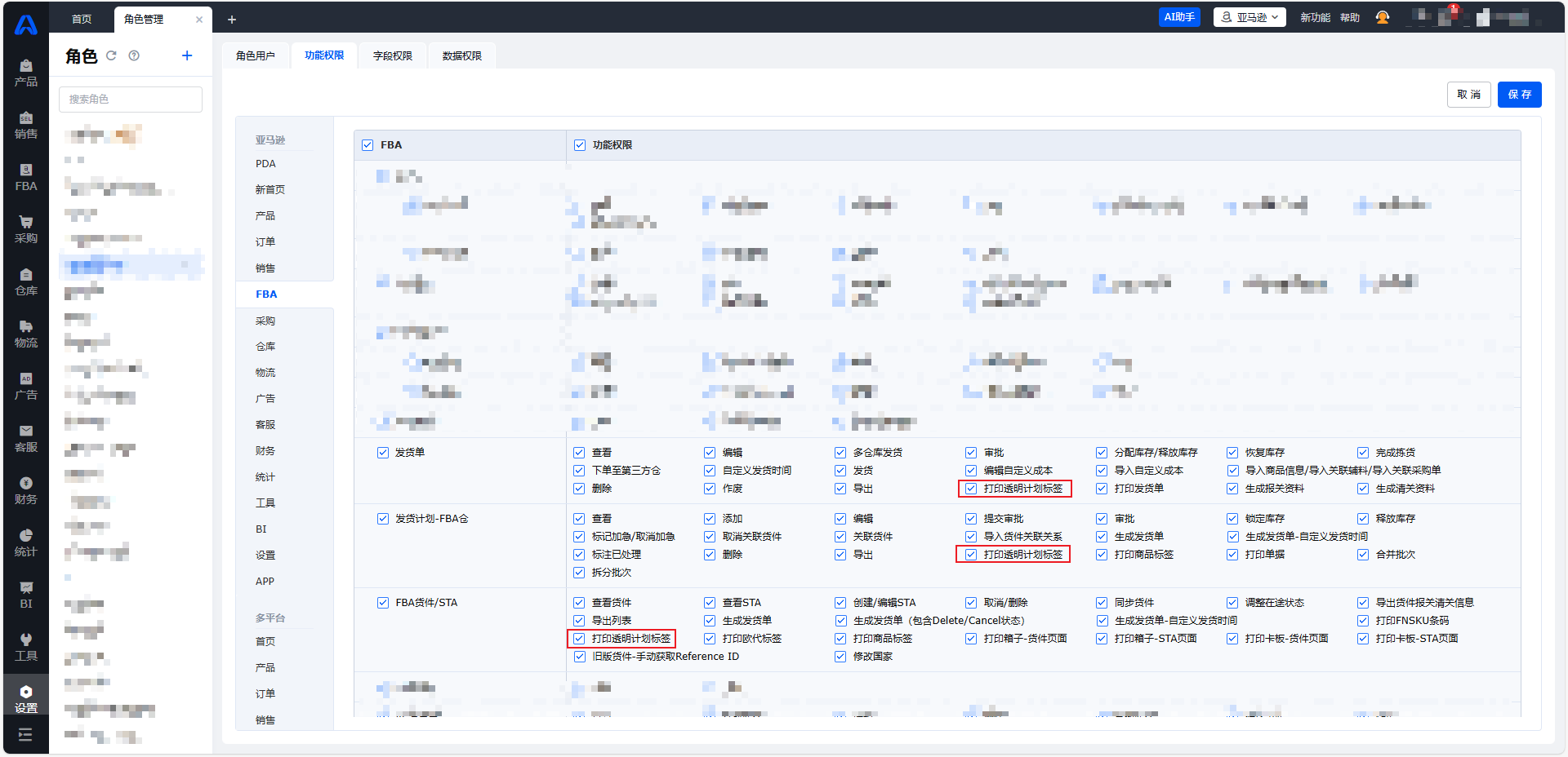 业务模块打印透明计划标签,需要勾选对应板块的【设置-角色管理-选中对应角色-功能权限-(亚马逊)FBA-发货计划/发货单/FBA货件-打印透明计划标签】。