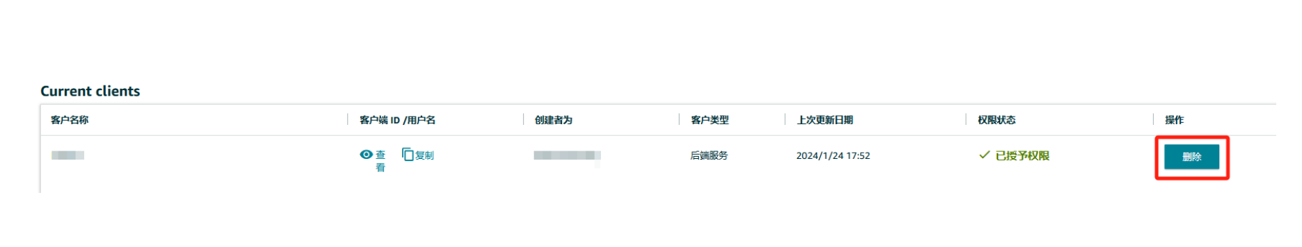 进入【管理API-Current Clients】中找到要删除的Client,点击删除(推荐执行此步骤,若无法删除则跳过)