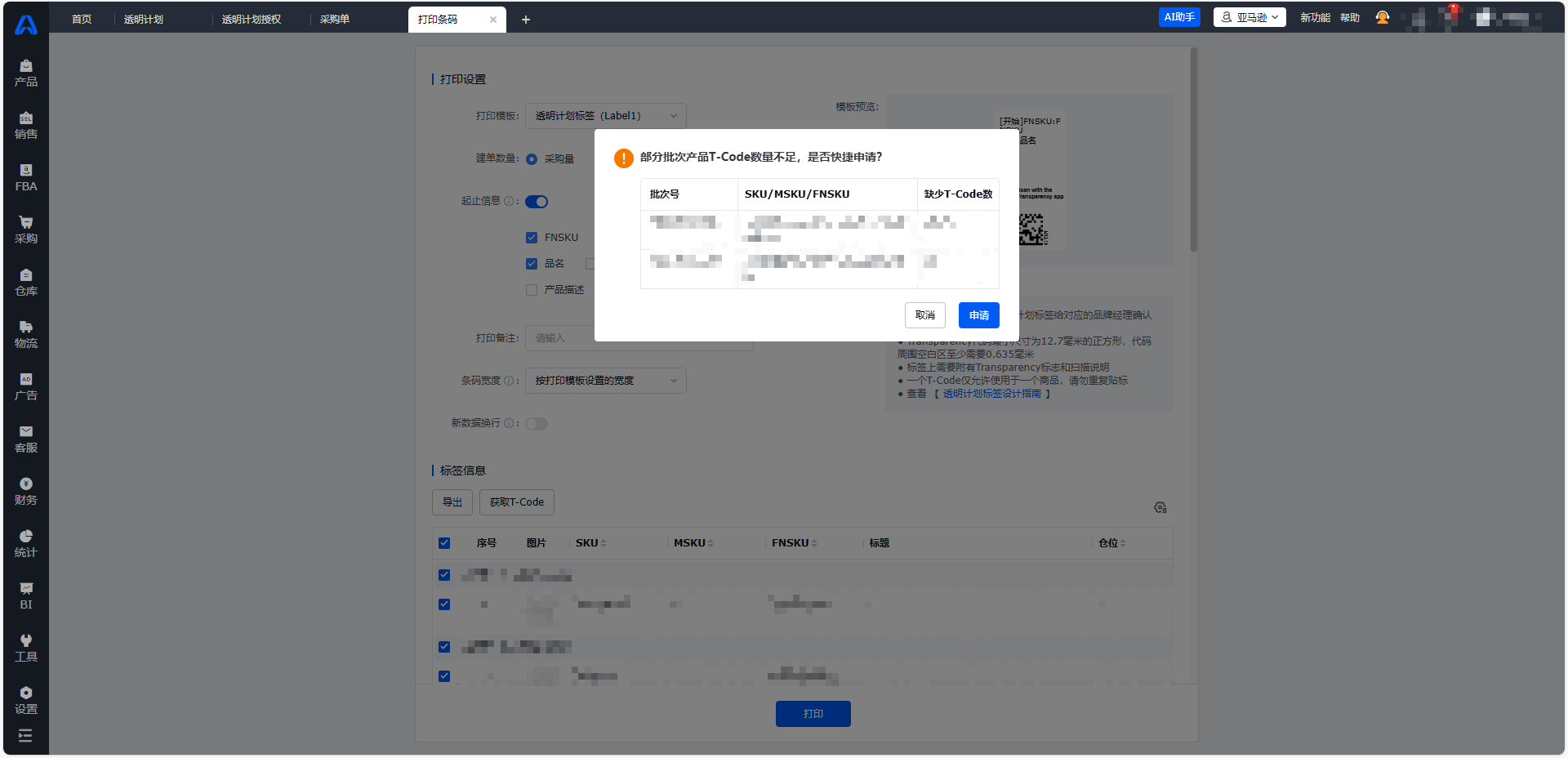 只有透明计划商品支持打印透明计划标签,勾选的数据中若包含非透明计划商品将会过滤不展示
