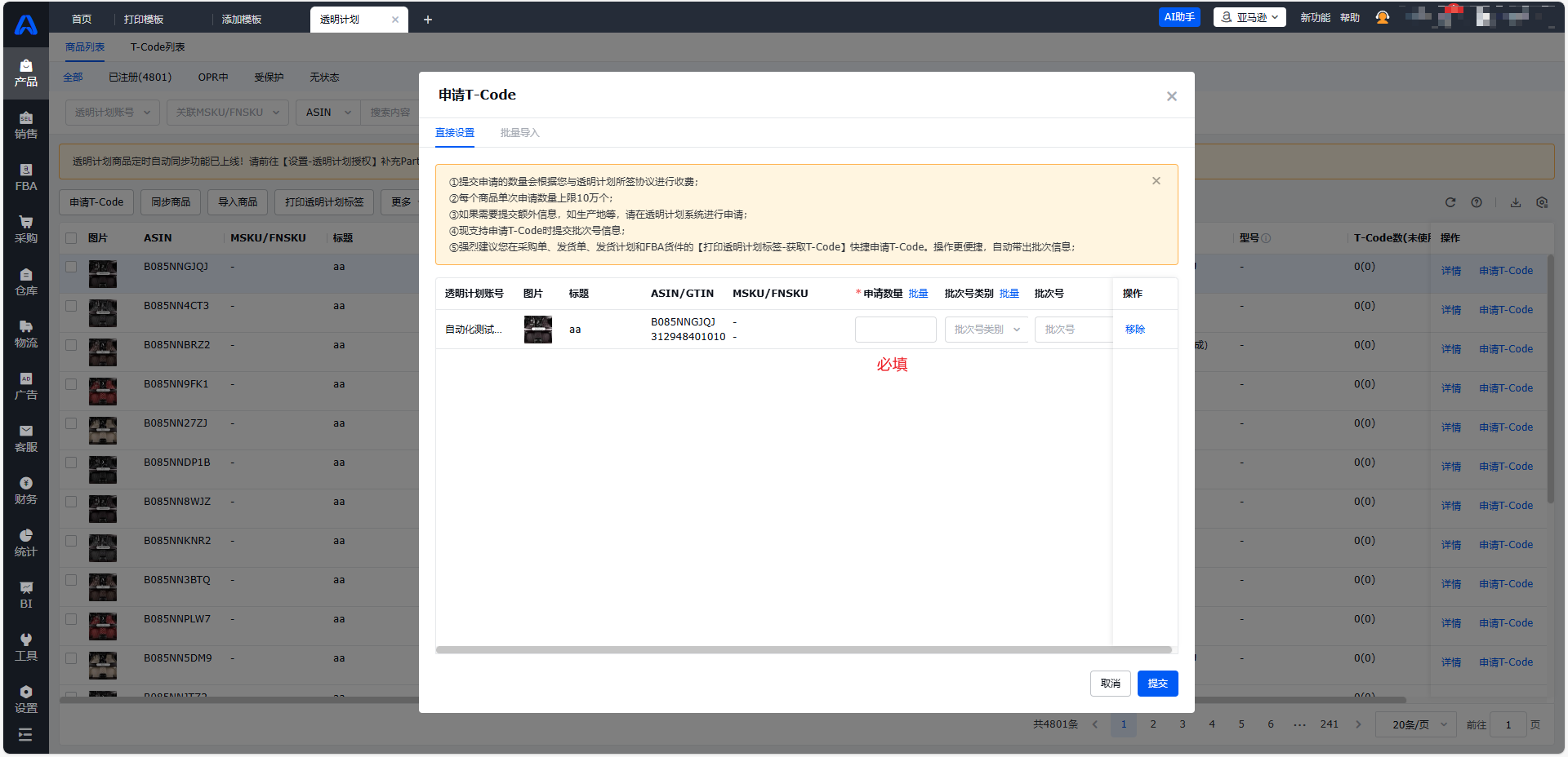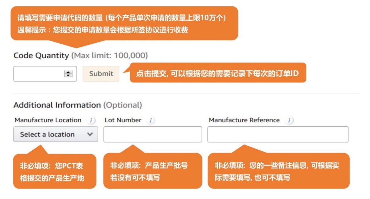 目前领星接口仅支持申请时填写:申请数量、批次号。亚马逊透明计划后台支持提交额外信息(如生产地等),如需这些信息请在亚马逊透明计划后台申请