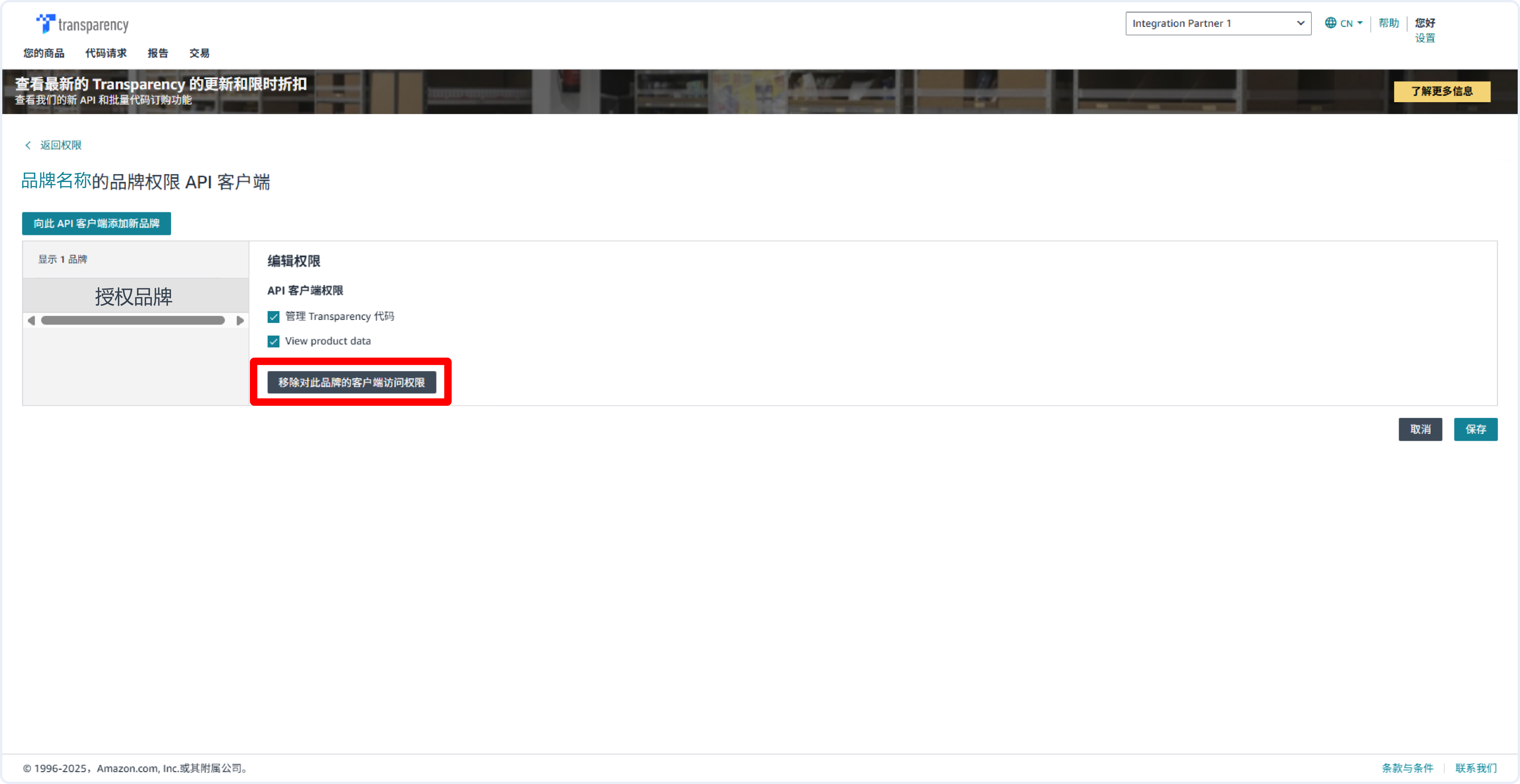 进入亚马逊【管理权限-当前的API客户端】中找到需要取消权限的API CLient,点击【移除品牌对此API客户端的访问权限】