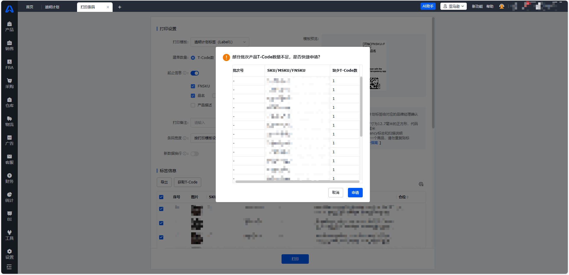 若T-Code数量不足,会跳转到申请弹窗并自动带出申请信息(没有批次号类别、批次号信息)